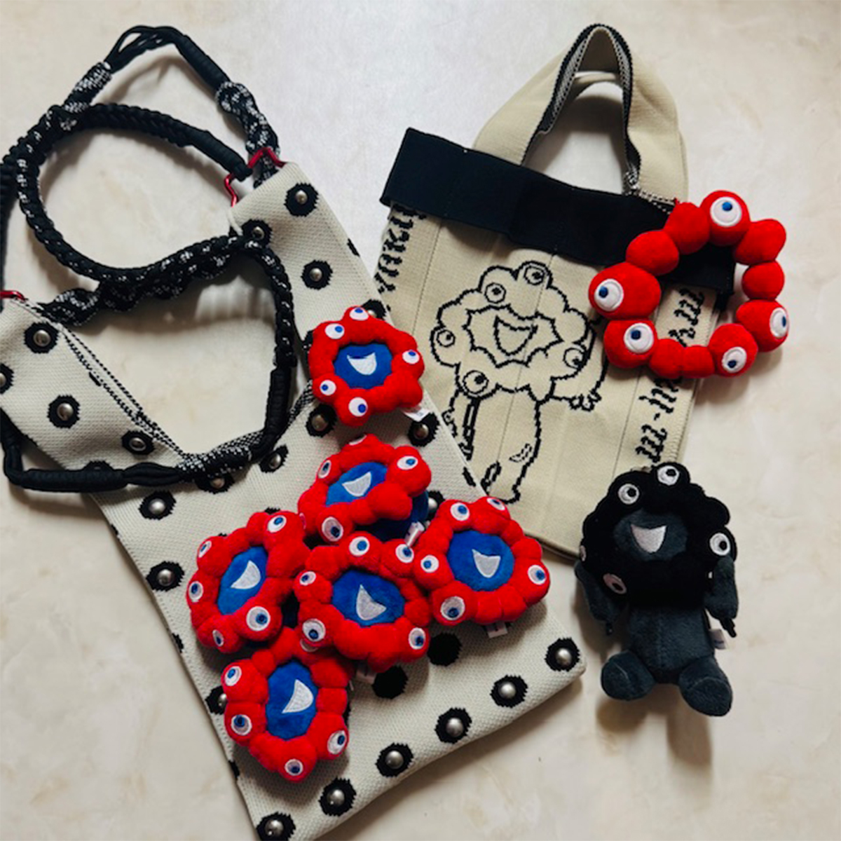 8 バックたち。左は私の誕生日にアシスタント達がグッズを集めてリメイクしてプレゼントしてもらった大切なもの。そして、レアな黒ミャクミャクも