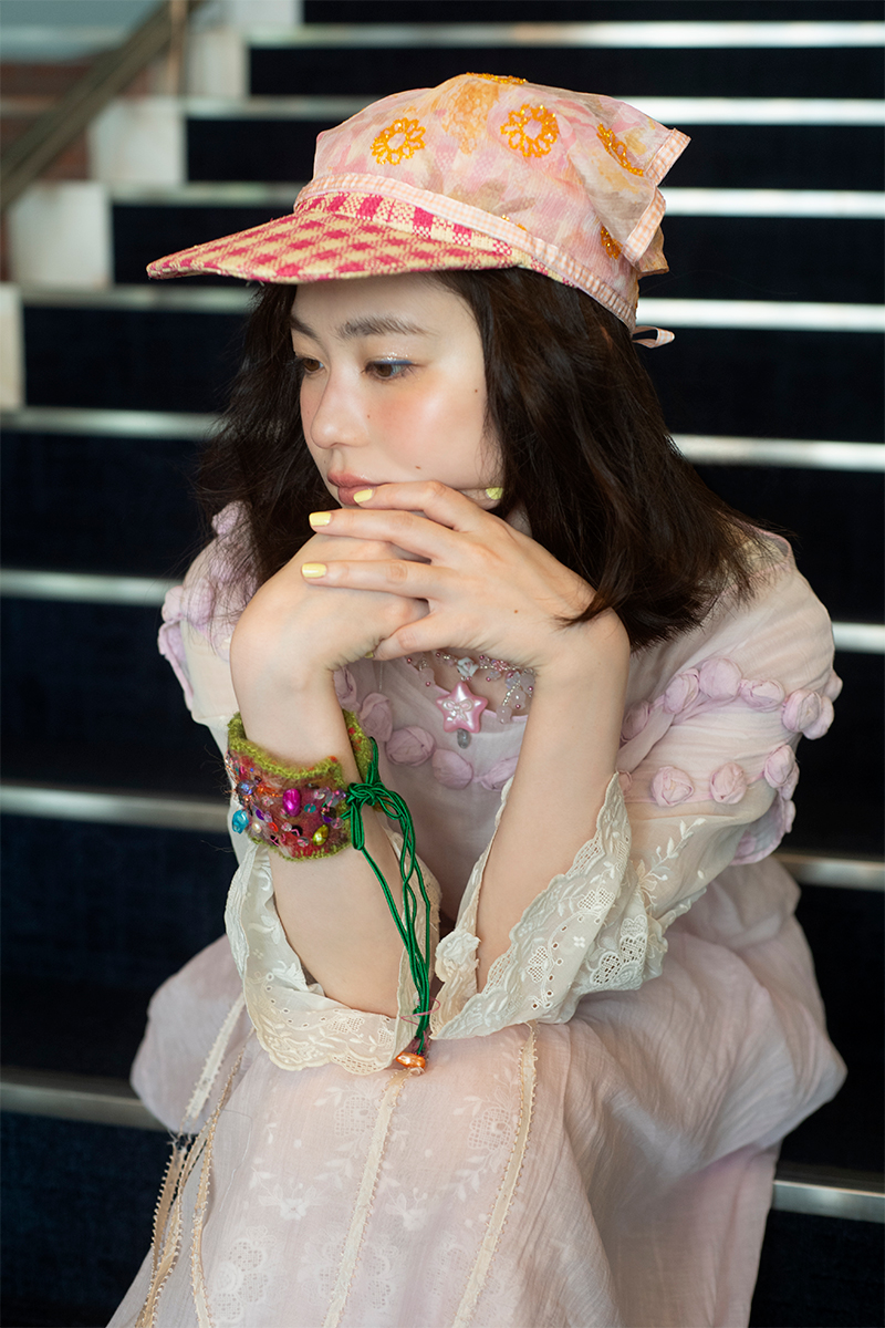 ピンク色の1930年代ドレス ¥55,000 3 to 8 Vintage apartment store / 下に着用したホワイトの1900年代ワンピース ¥66,000、帽子につけたスカーフ ¥8,800 シーロン(シーロン プレス ルーム) / ブレスレット ¥22,000 MATHILDE HIRON (seasonvoice)/ その他 スタイリスト私物