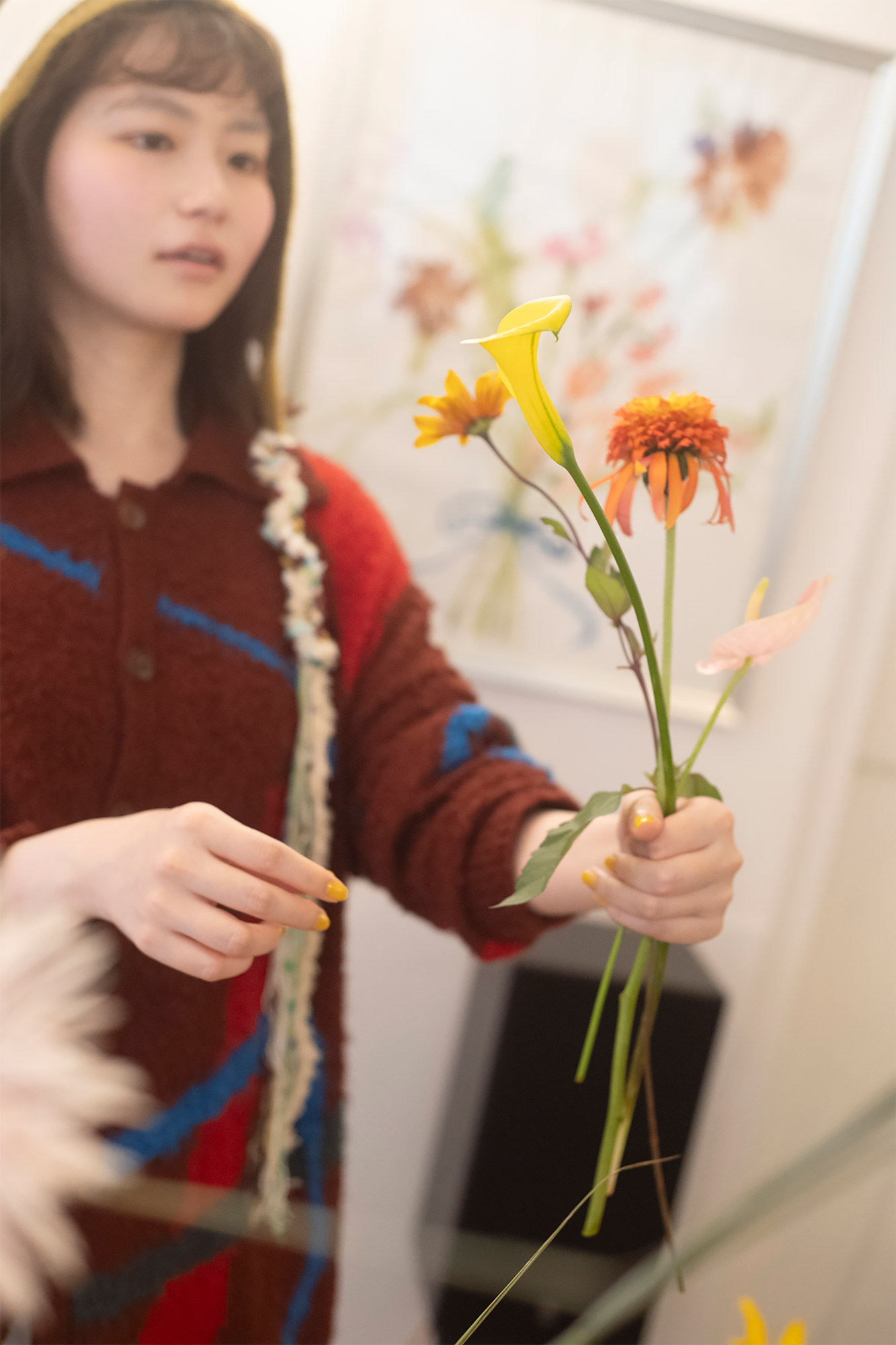 「上手ですね!本当のお花屋さんみたいです」という中井さんに、「小さい頃にピアノと美術を習って、手を使ってきた経験が生きているのかもしれません」と山田さん。「どの角度でお花を見せれば、もっと美しくなるかを考えてから配置や向きを決めると、より良くなると思います」と、中井さんがさらに上達するためのアドバイスをくれました。
