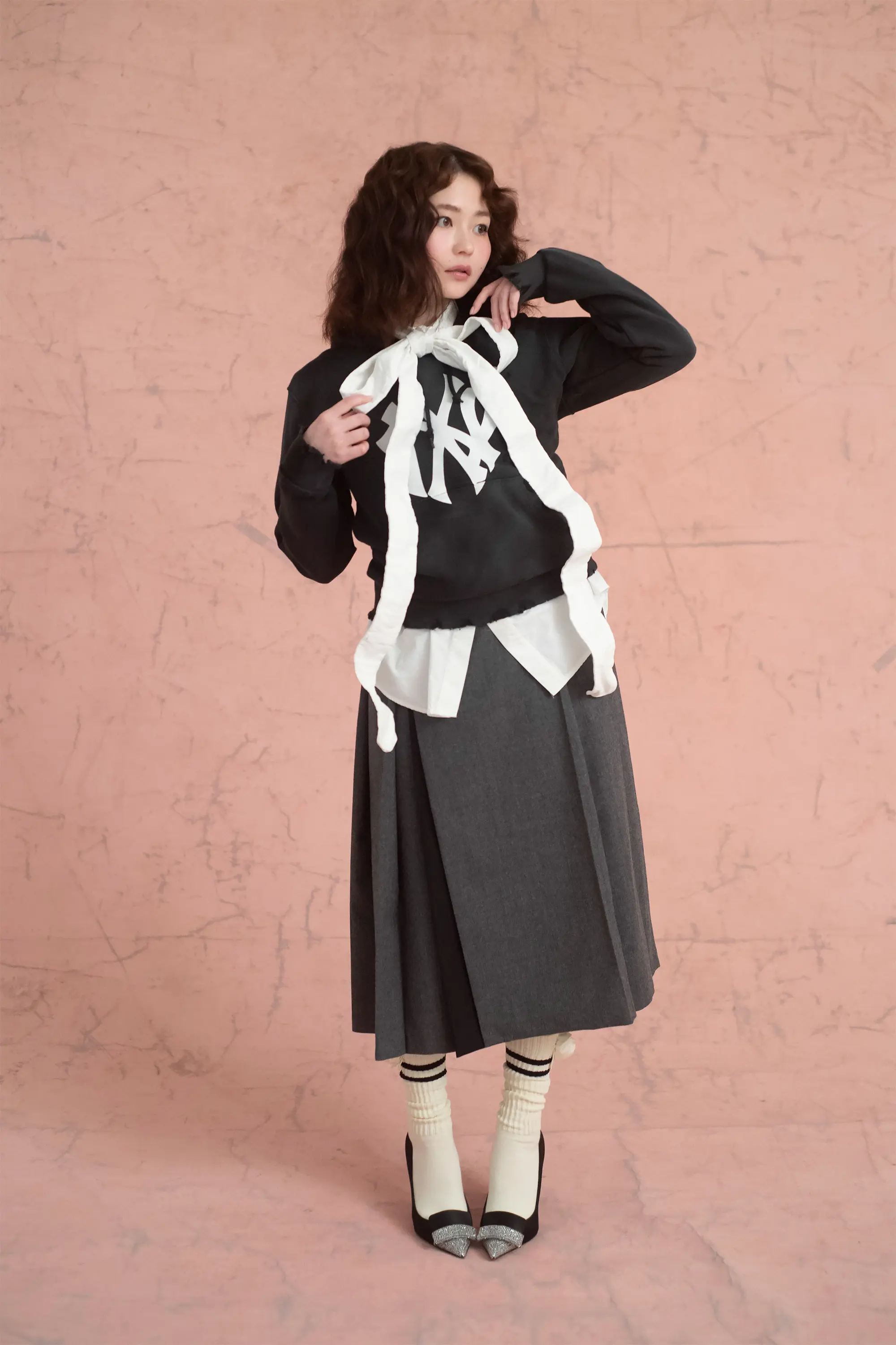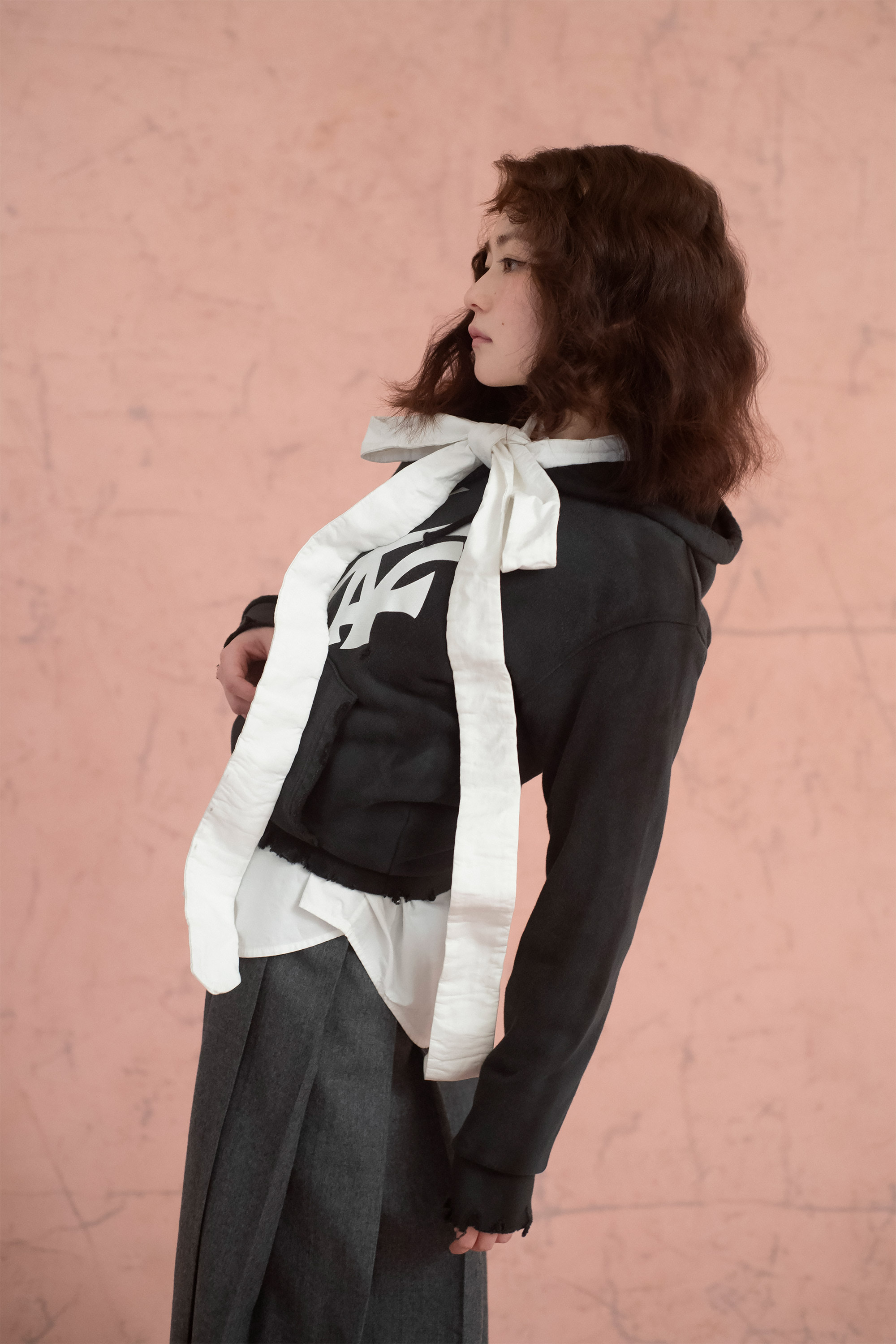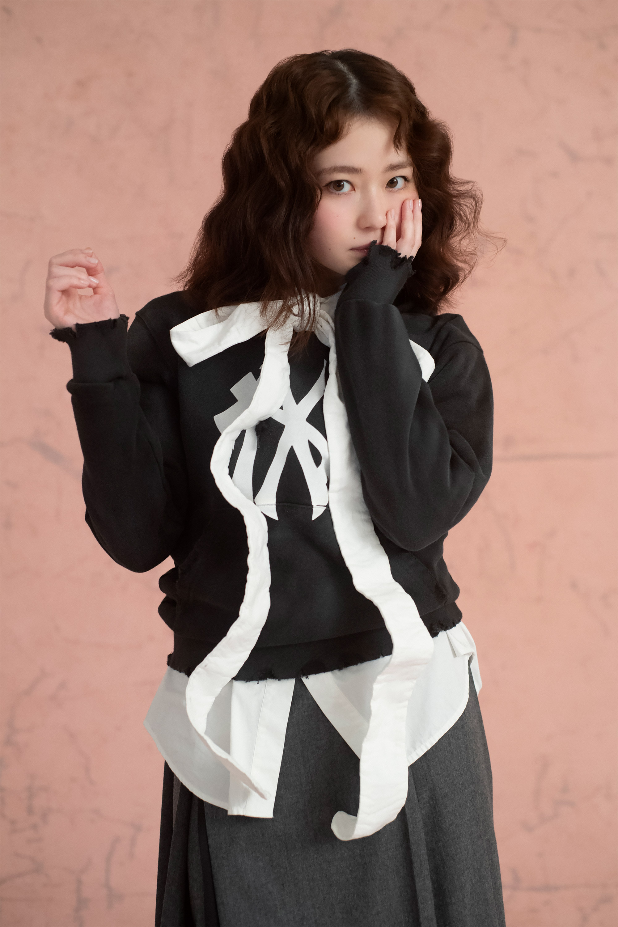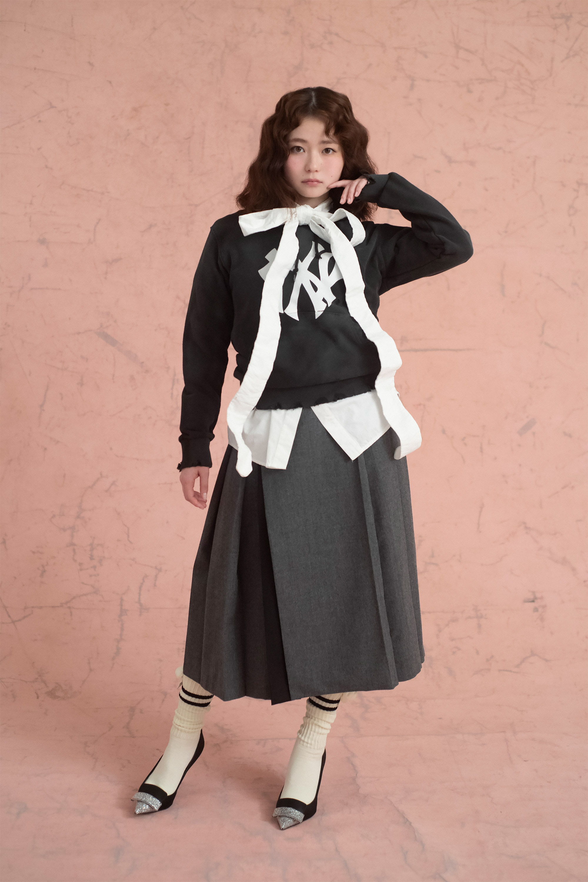 —— まさに次ページではワッペンつきのニットを着ていただいていますが、このページの、カレッジスウェットにリボンシャツという組み合わせも、とってもお似合いでした。