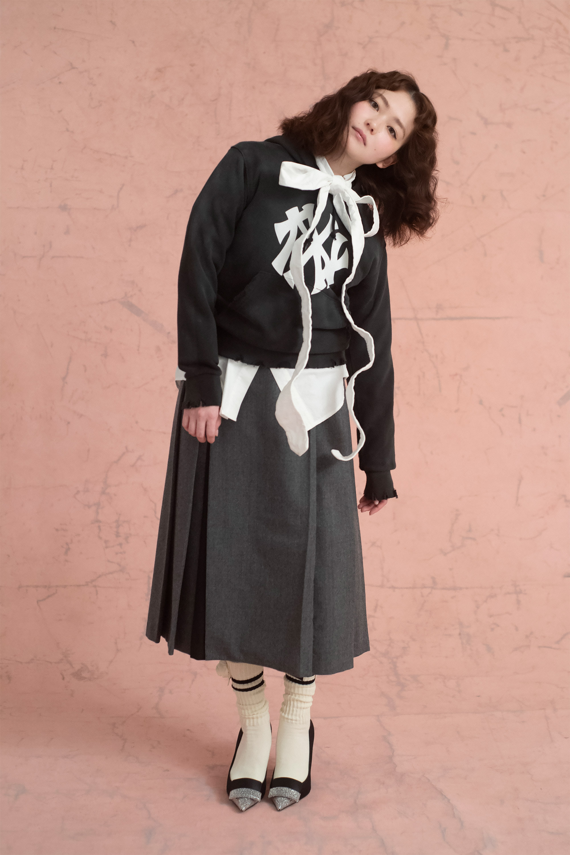 フーディー ¥22,000 リコール (エスティーム プレス) / 中に着たリボン付きシャツ ¥59,400、薔薇つきのソックス ¥13,200 ヴィヴィアーノ / グレースカート ¥71,500 クイーン アンド ジャック(エスティーム プレス) / 黒パンプス 参考商品 セルジオ ロッシ (セルジオ ロッシ ジャパン カスタマーサービス)