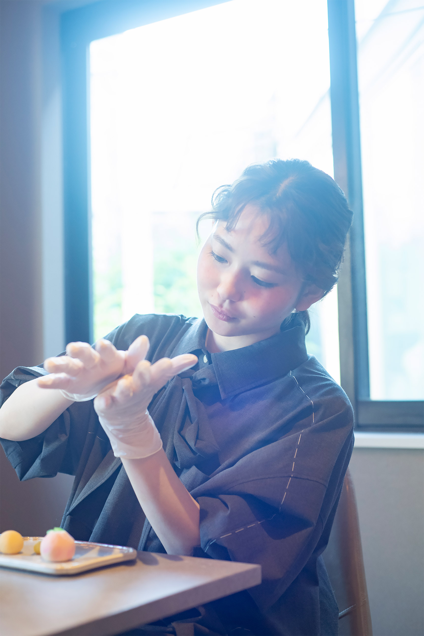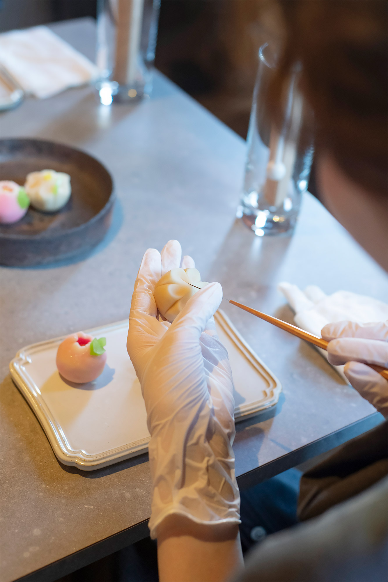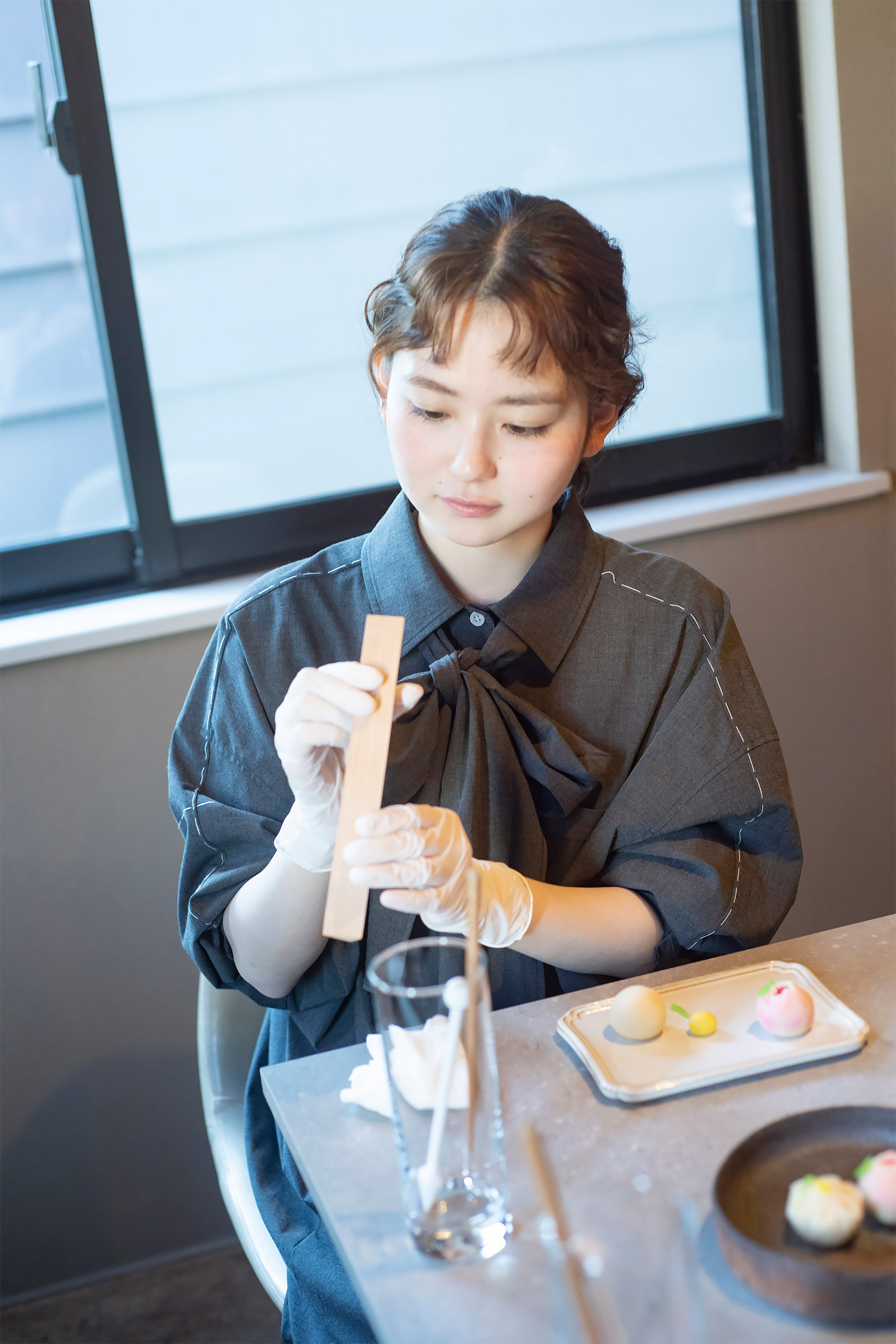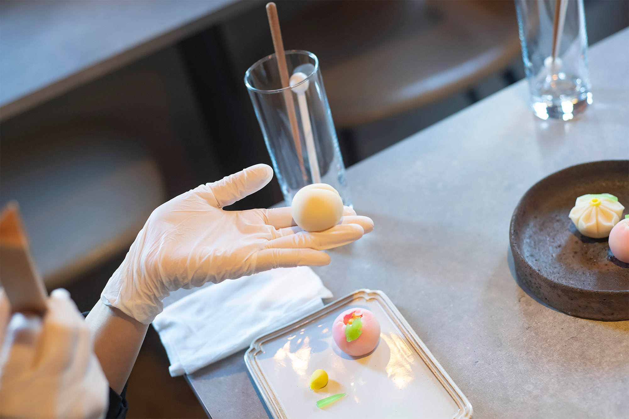 「寒牡丹」と同じように、まずはベースになる練り切り餡をころころと丸めます。餡を丸めるときは手のひら全体を使うというコツを掴んで、早くも所作が板についてきた山田さん。