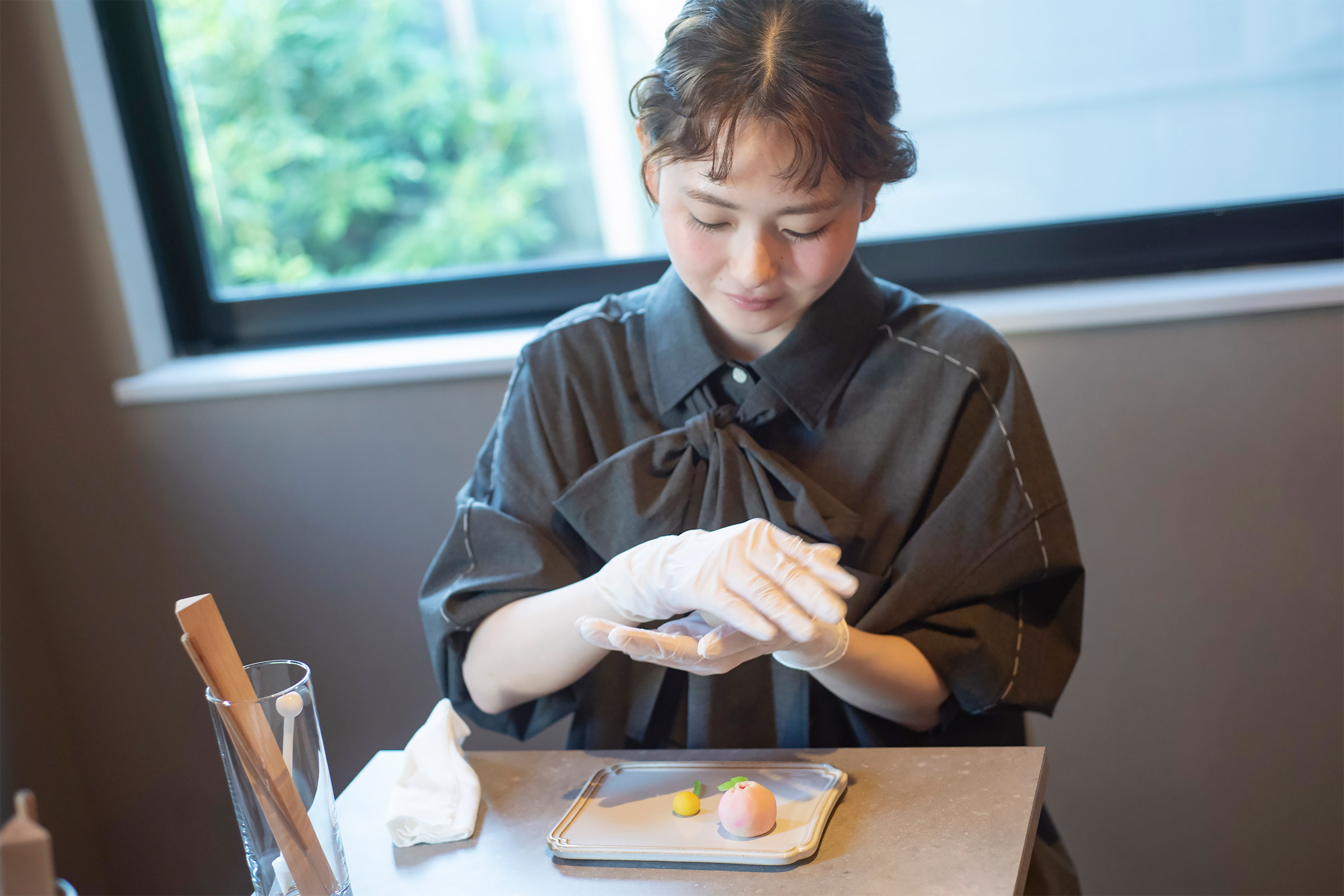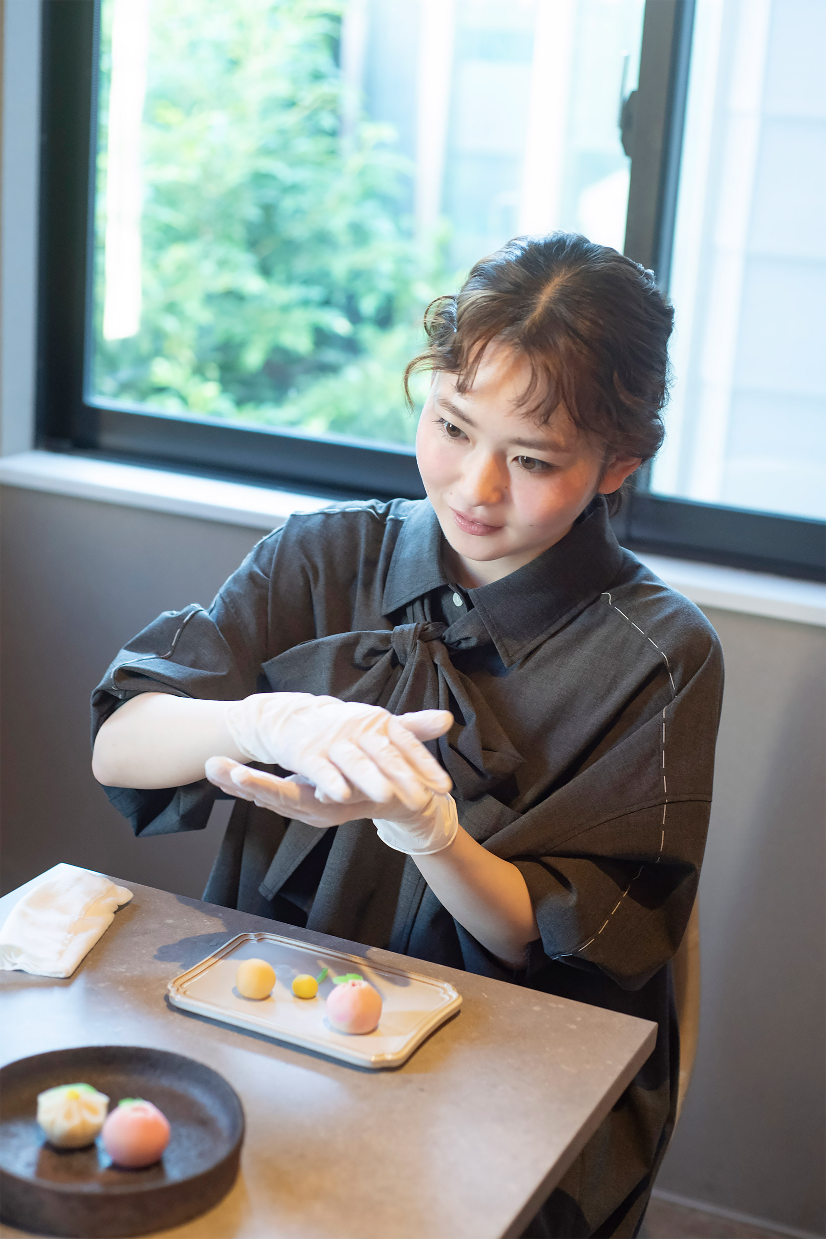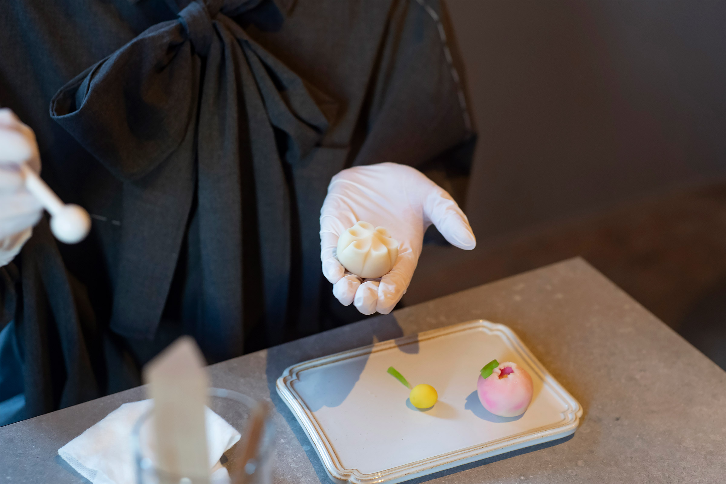 「寒牡丹」と同じように、まずはベースになる練り切り餡をころころと丸めます。餡を丸めるときは手のひら全体を使うというコツを掴んで、早くも所作が板についてきた山田さん。