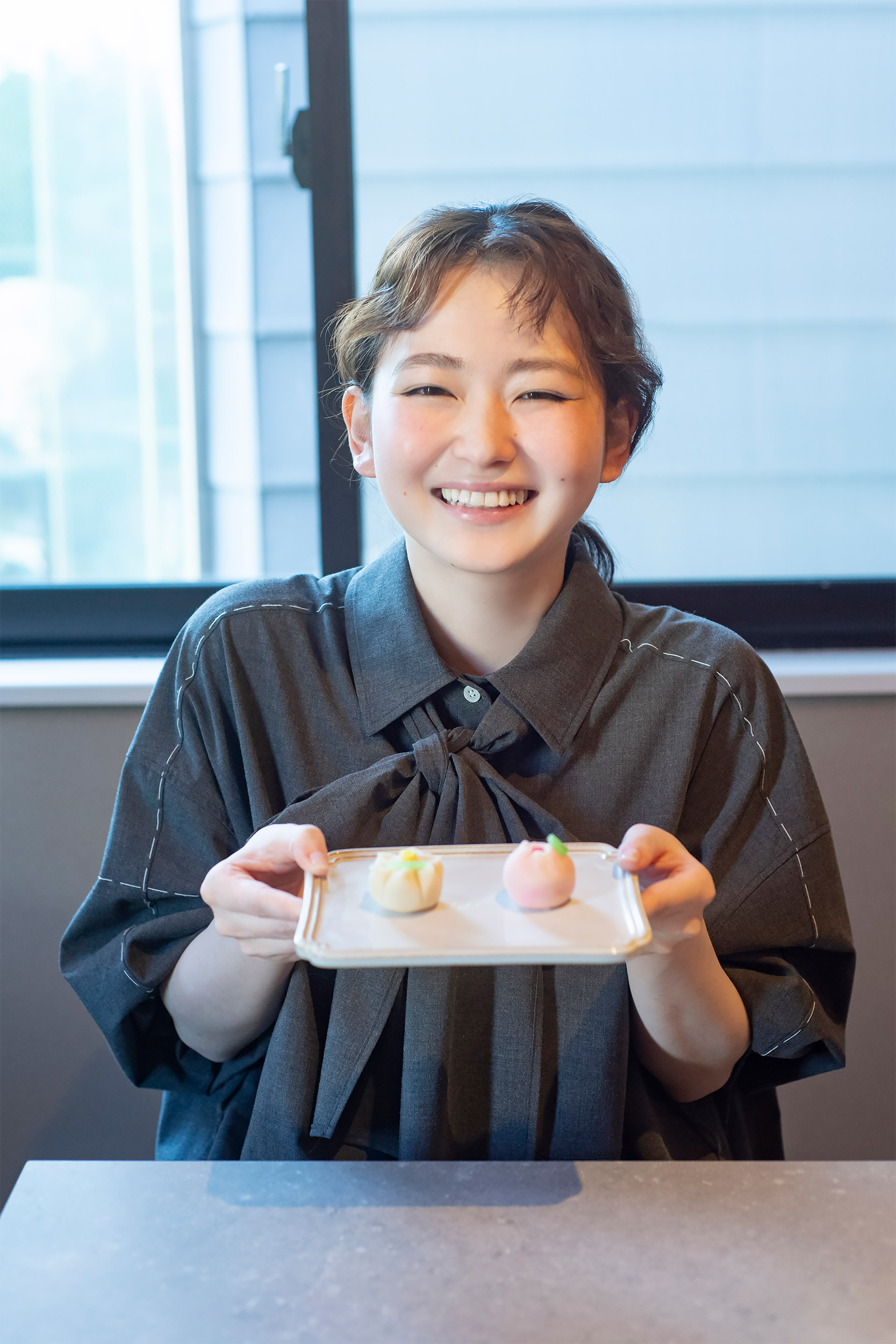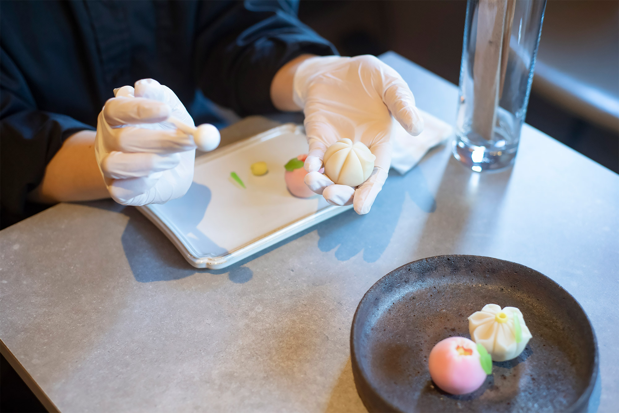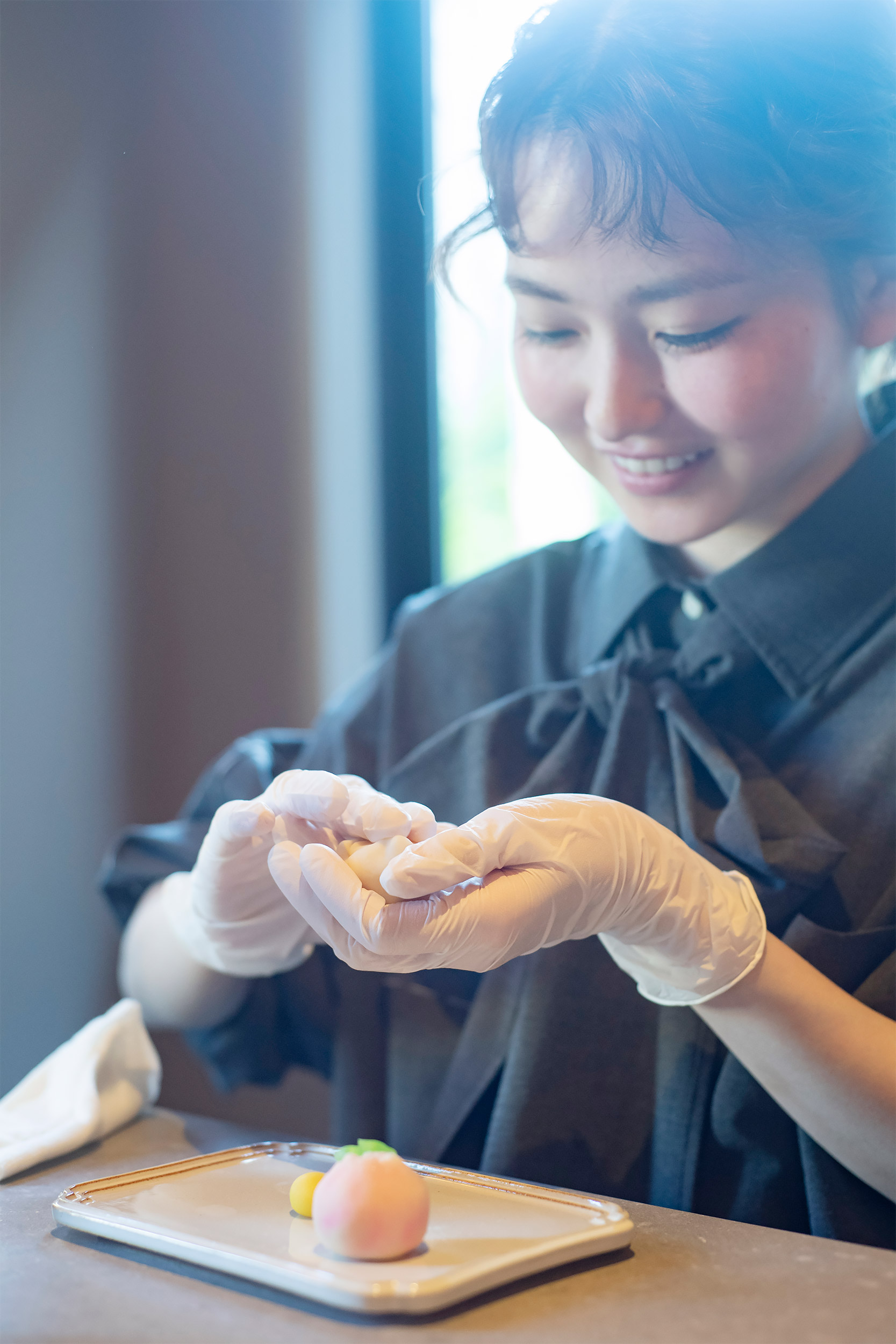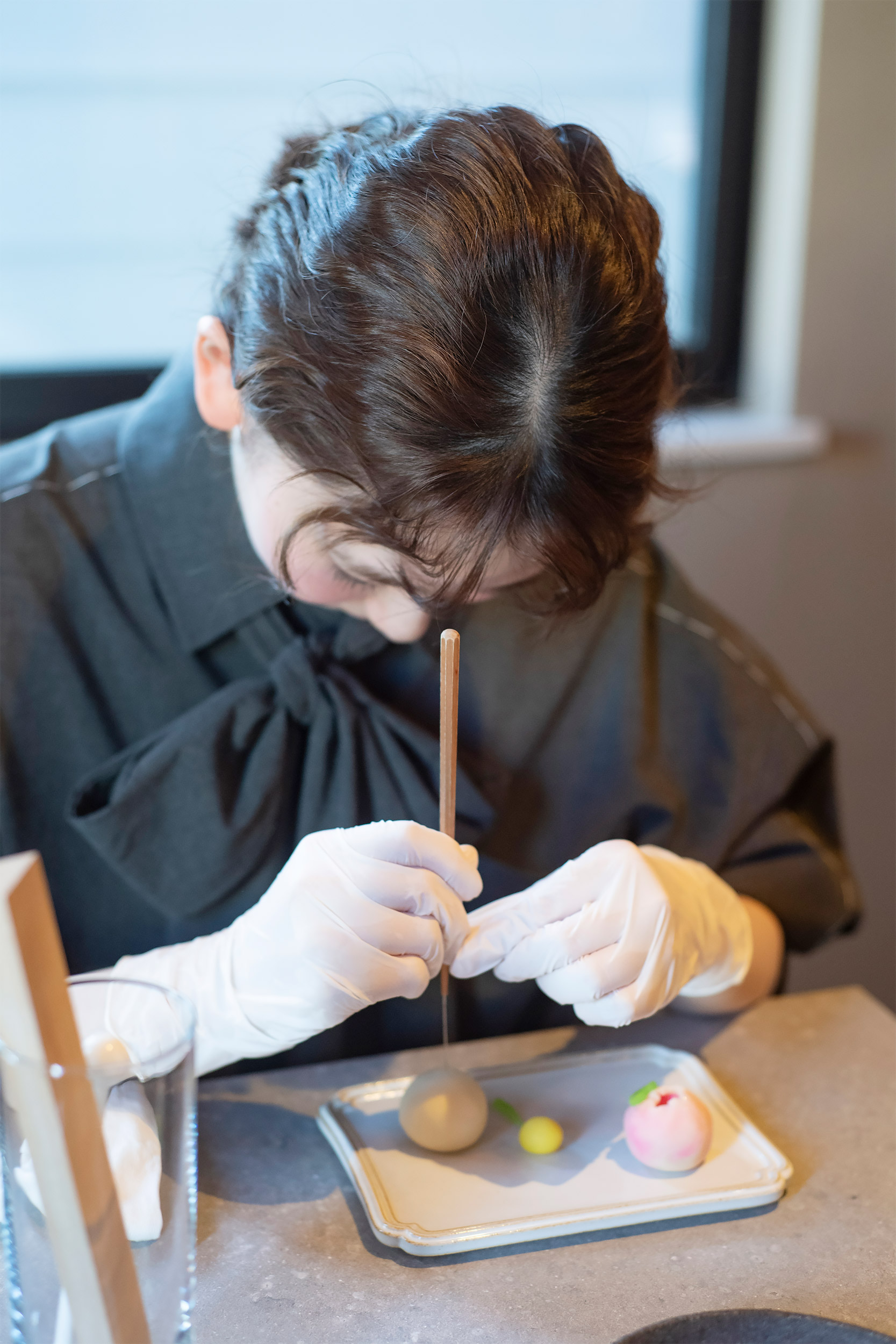 「寒牡丹」と同じように、まずはベースになる練り切り餡をころころと丸めます。餡を丸めるときは手のひら全体を使うというコツを掴んで、早くも所作が板についてきた山田さん。