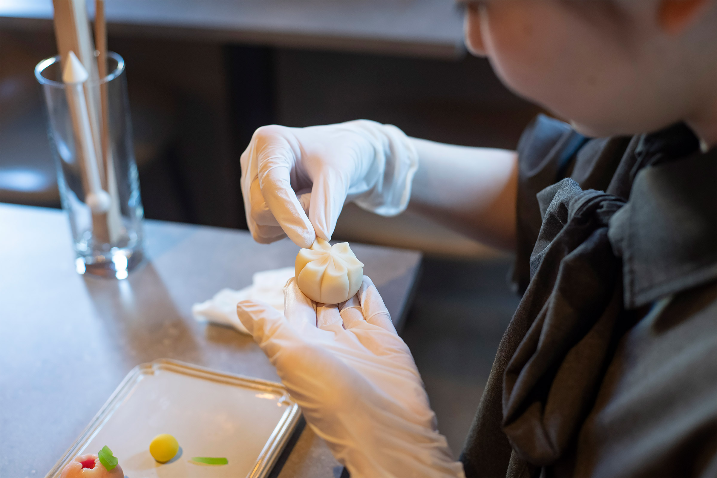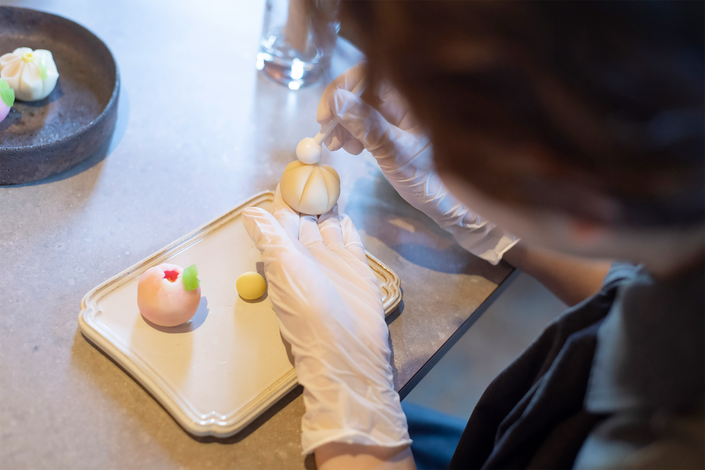 お寿司職人の握り技も再び。丸めた白餡を指の付け根に置いて抱え込むようにして持ち、中に入れる餡を中央に乗せて、もう片方の指2本で時計回りに動かしながら握っていきます。続いて反時計回りに餡を動かし、外側の餡を、内側の餡の上にかぶせるように押します。外側の餡の閉じ目は指でつまんだ後、トントンと押さえます。