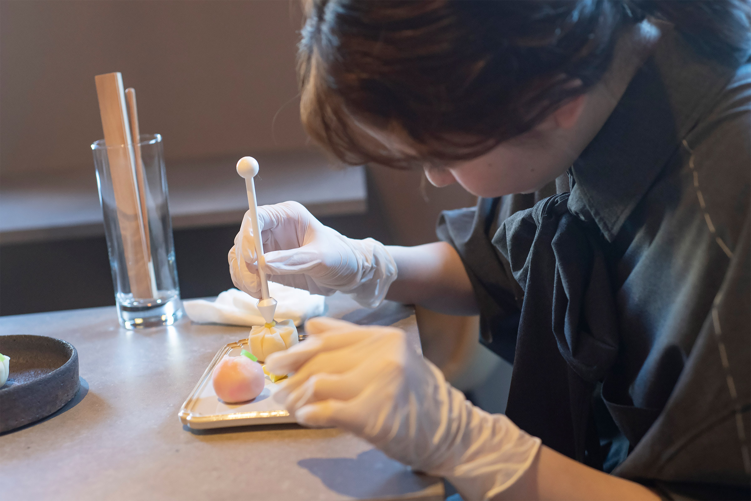 黄色の餡を、円錐形のスティックで真上から中央にまっすぐ押し込みます。さらに葉っぱを好きなところに飾って……。