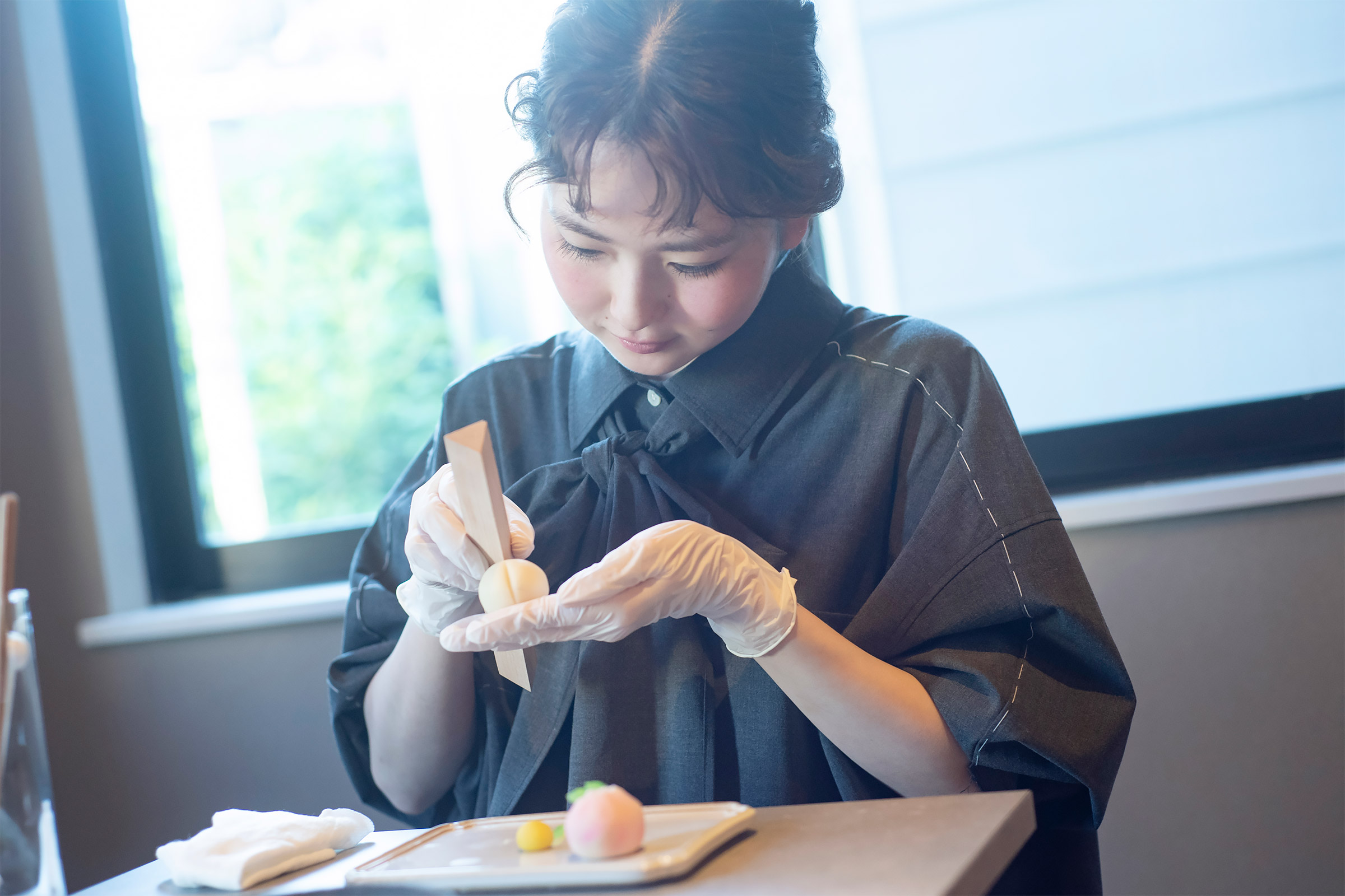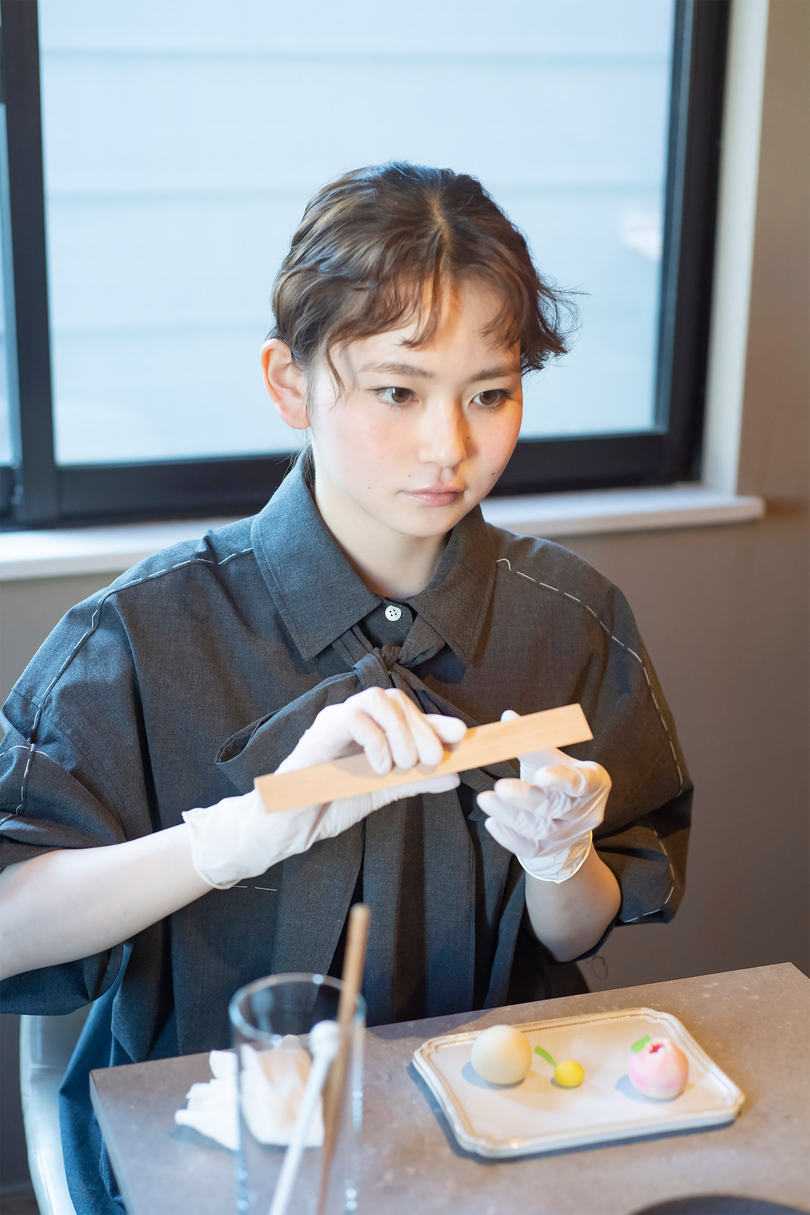 練り切りを左手中指の第一・第二関節を中心にして持ち、体と平行になる高さにします。右手で持った三角棒をまっすぐ立てて、切り込みを入れたい場所に向かってまっすぐに下ろすと、写真のようなきれいな線が入ります。緊張感たっぷりの工程ですが、山田さん、成功です!