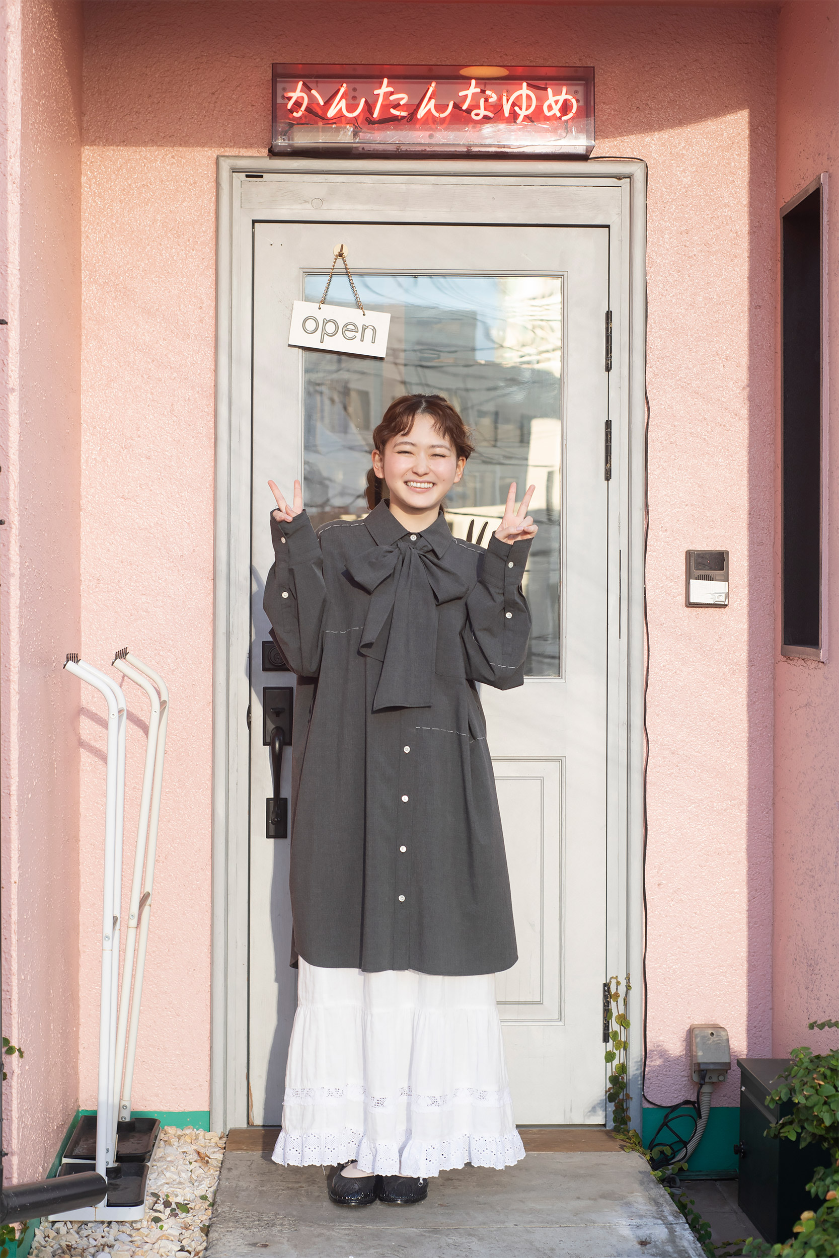 グレーのリボン付きシャツ ¥23,100 メゾンスペシャル(メゾンスペシャル 青山店)/白スカート ¥16,940 アッシュ/黒シューズ ¥155,100 ピエール アルディ(ピエール アルディ 東京)/ソックス スタイリスト私物