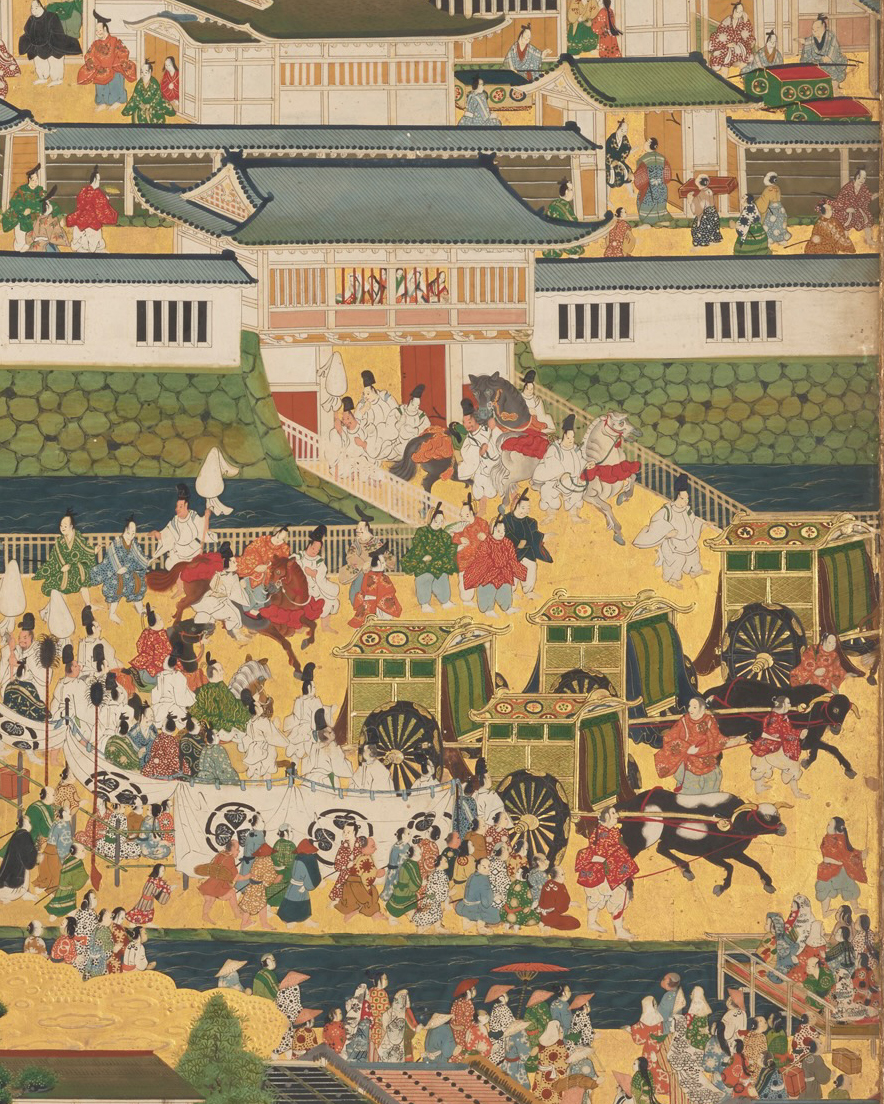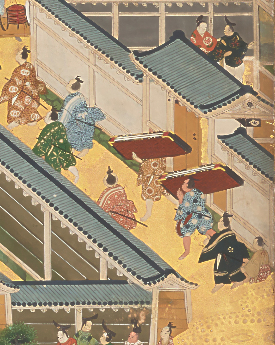 内裏近く、行列の一行とは異なる道筋に、屛風を抱えて急ぐ 2 人の男衆の姿がある。何ら梱包もされず、新調したばかりの屛風を納めに走っているのはなぜだろうか?