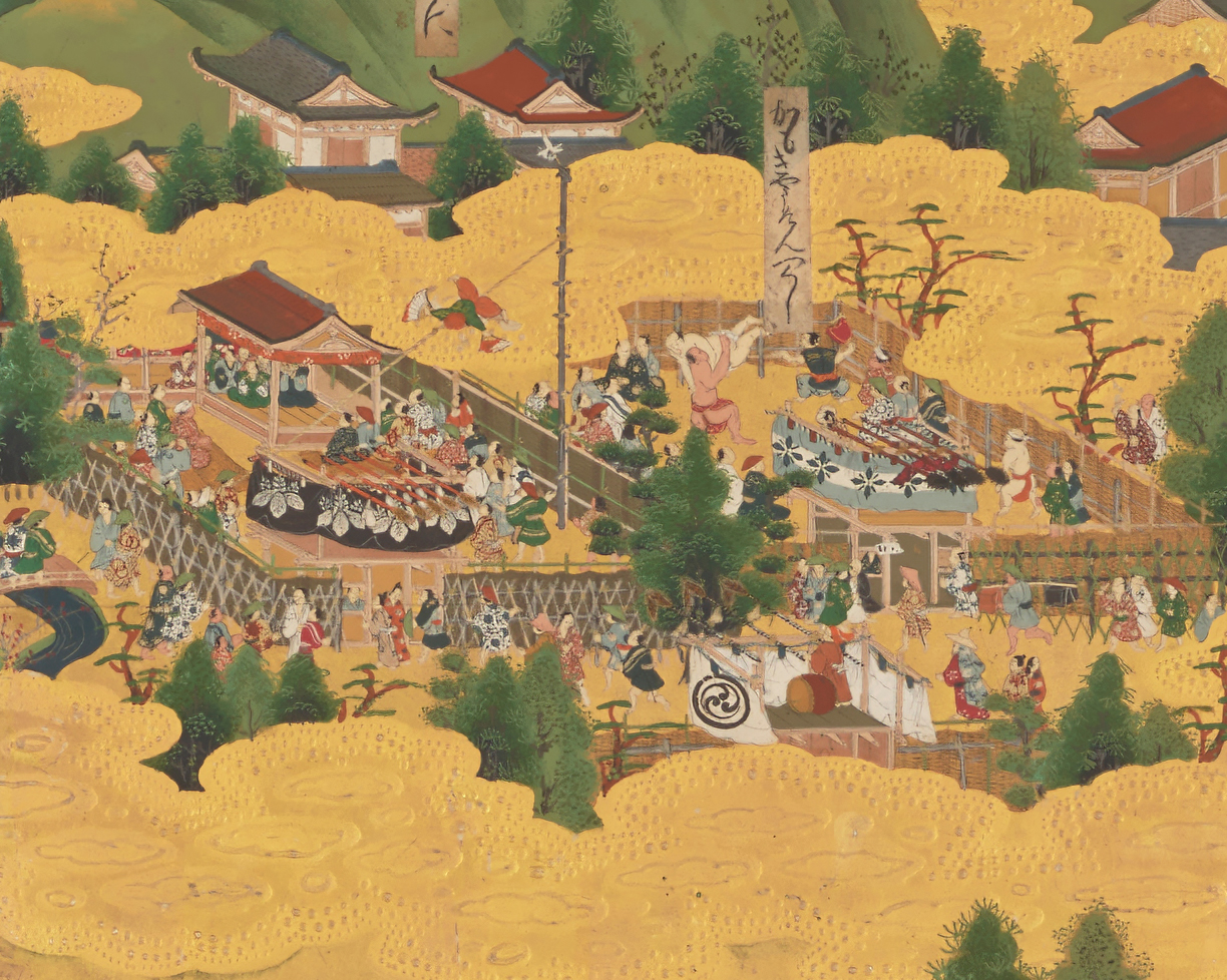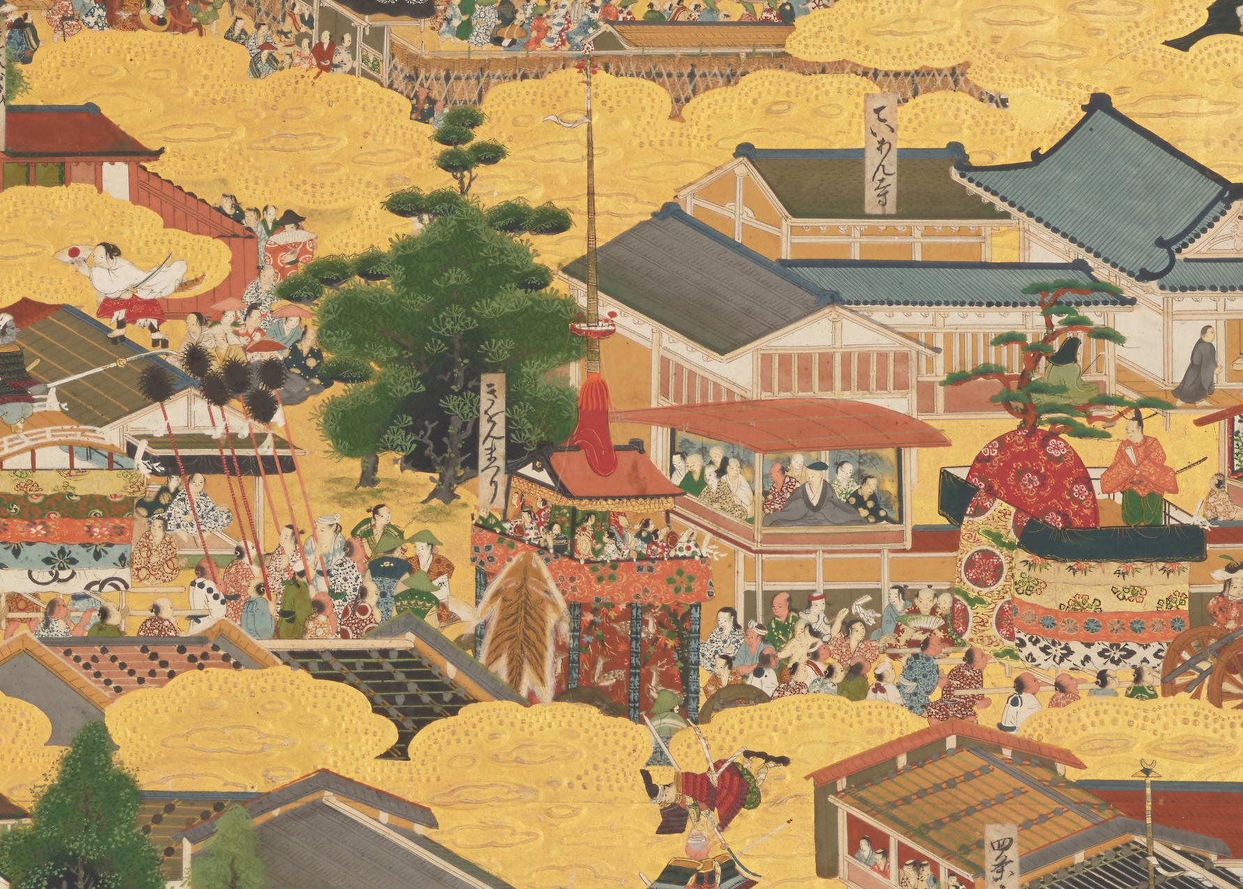 祇園祭の山鉾巡行では、町衆たちが松の木や鉾や甲冑などできらびやかに装飾した町自慢の山車を誇らしげに轢いている。長く続いた戦乱の世が終わり、やっと訪れた泰平の世を心から楽しんでいるように見える。
