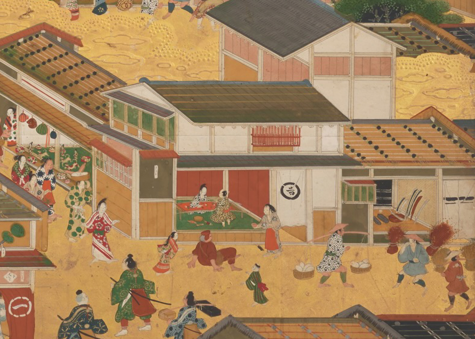 相撲のイベントや、町のあちこちで開かれている軽業師の曲芸を見物する人々。店が並ぶ通りでは武士や行商など、行き交う人々の姿もさまざま。豊臣秀吉の治世以降、二階建ての家が増えるなど、建築的な視点から見ても楽しめる。