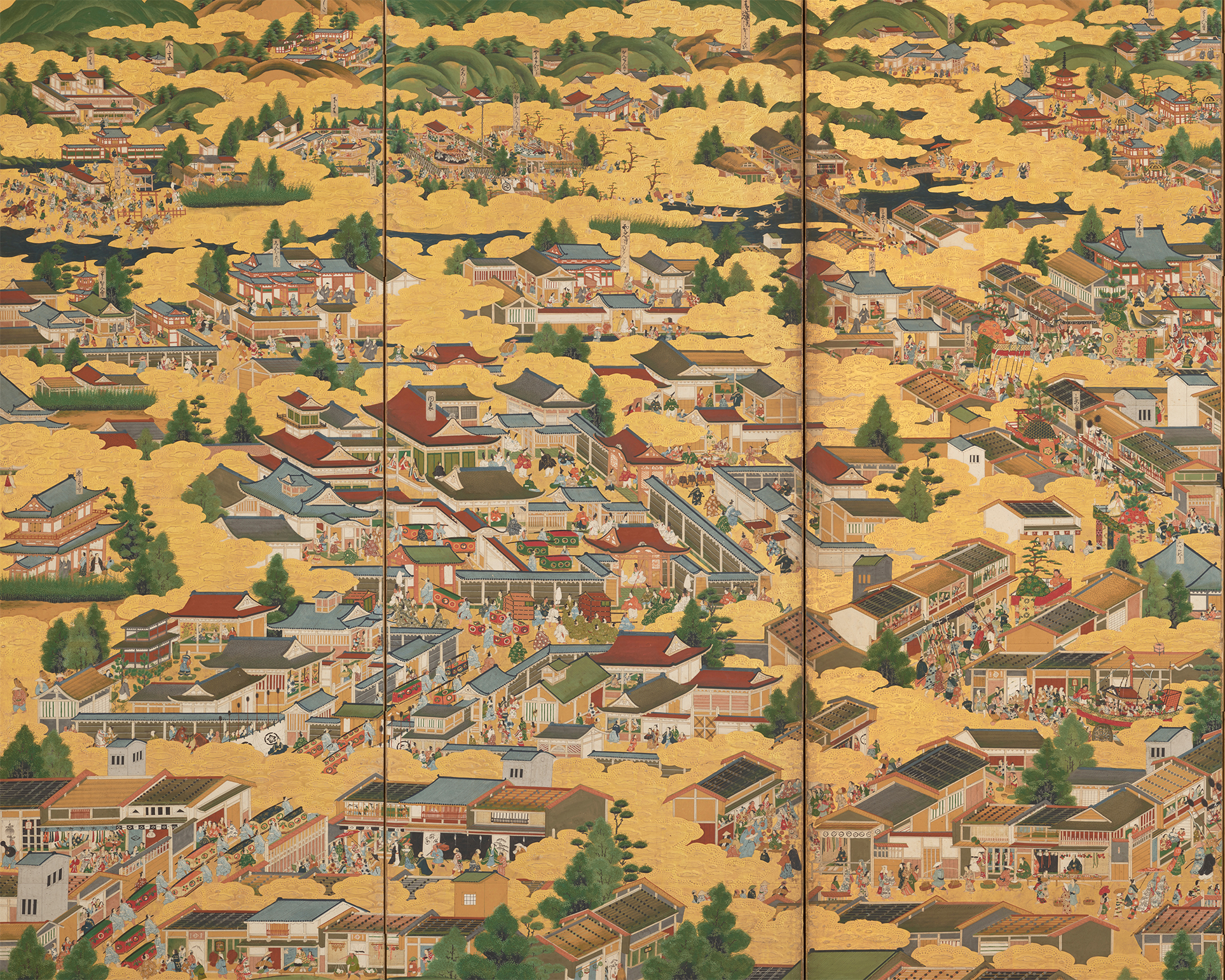 「洛中洛外図屛風」とは、京都の街中(洛中)とその近郊(洛外)の俯瞰風景が描かれた屛風仕立ての絵画のこと。画中には、山や川などの自然景観とともに、橋や通り、寺社、内裏、城、屋敷、商店、住居などの建築群が点在する中、祇園祭の山鉾巡行や歌舞や酒宴といった遊楽などに興ずる各階層の老若男女が登場する。描かれた人々の数は2000人以上とも言われ、人々の表情や装い、持ち物も緻密に描かれている。