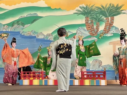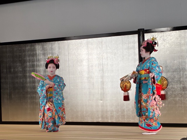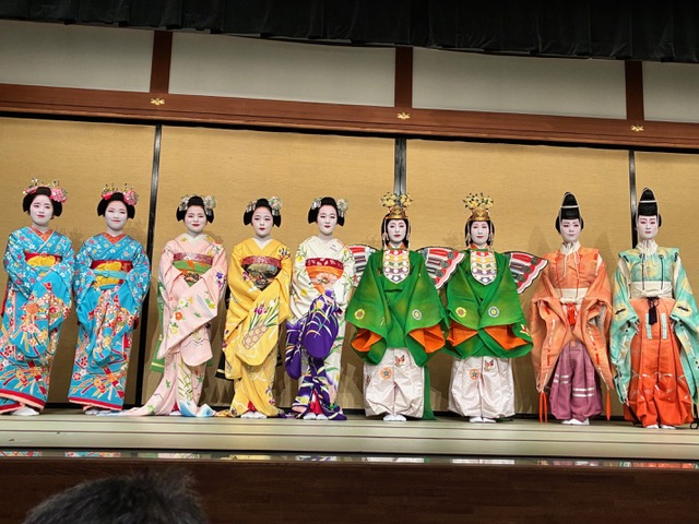 令和八年公演の演題は『寛永行幸都華麗(かんえいぎょうこうみやこのはなやぎ)』で、寛永行幸にちなんだ舞台が構成され、後水尾天皇の文化サロンを中心にした寛永文化に想いを馳せる。公演は八景という 8 場面からなるが、どれも季節ごとの雅で華やかな彩どりの絵巻のような舞舞台。二条城における饗応の場面はハイライトで、舞楽の舞や蹴鞠など、人間国宝 京舞井上流 家元 五世 井上八千代師の熱心な指導のもと、芸妓たちが、宮廷文化の雅を衣装と舞で表現する。