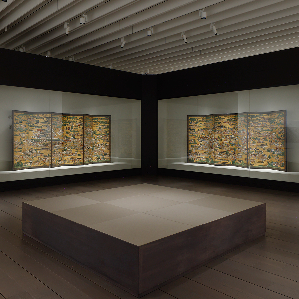 アーティゾン美術館で開催されている「カタリウム展」に足を踏み入れると突然、静寂の中に一双の屛風が現れる。部屋のコーナーを活かしてガラス展示ケースの中に置かれた屛風は、左隻右隻がちょうど90度に向かい合う。その前には、大きな正方形のベンチが置かれ、ゆったりとした空気が流れている。通常、数多の作品とともに横並びで展示されることが多い屛風だが、本展では、一対の屛風に絞られていて、まるで囲まれているかのようにじっくりと鑑賞することができる。この空間で 4 月 2 日まで展示されていたのは江戸時代初期に描かれた洛中洛外図屛風。屛風は、絵画という二次元のものではあるが、ジグザグに立ててできる山と谷をうまく活用してモチーフを配することで立体感が演出されているそうだ。江戸時代の没入型パノラマビューというところだろうか。(現在は《江戸天下祭図屛風》を展示中。)