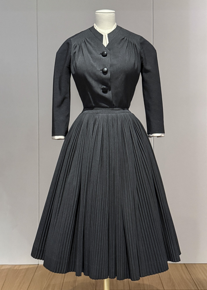 写真左:クリスチャン・ディオールによる1951年春夏オートクチュールのアンサンブル。右:ムッシュ ディオールが独立前に手がけた他社の作品も数点展示される。写真は、ディオールによるルシアン・ルロン1945年秋冬オートクチュールのドレス。