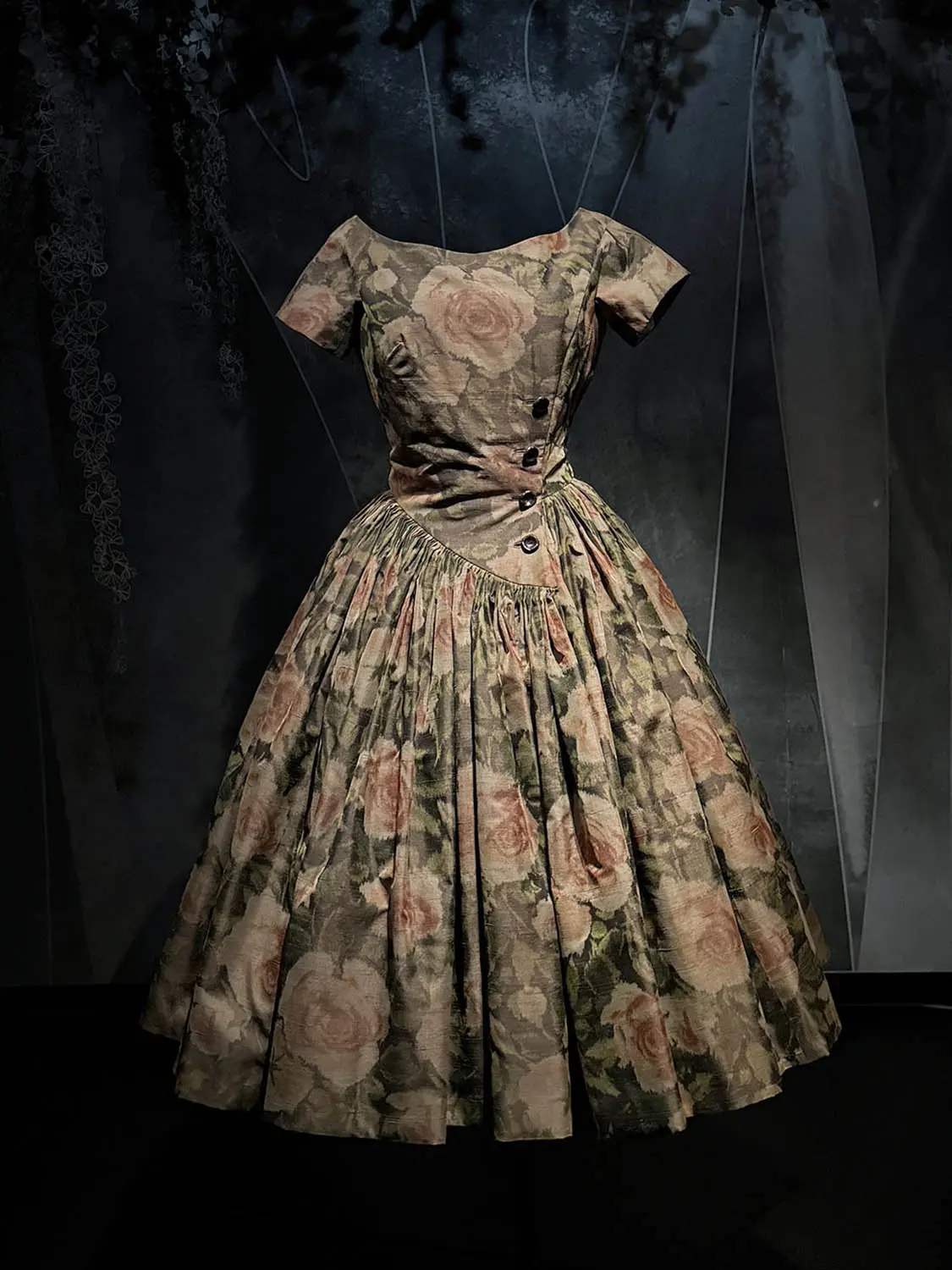 「アズディン・アライアが収集したDiorコレクション」展より。クリスチャン・ディオールが幼少期を過ごしたグランヴィルの家の庭をイメージした展示。中央は1955年春夏オートクチュールのドレス。