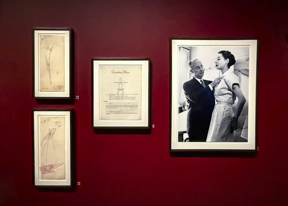 手描きのデザイン画、コレクションノート、フィッティングをするムッシュ ディオールの写真。