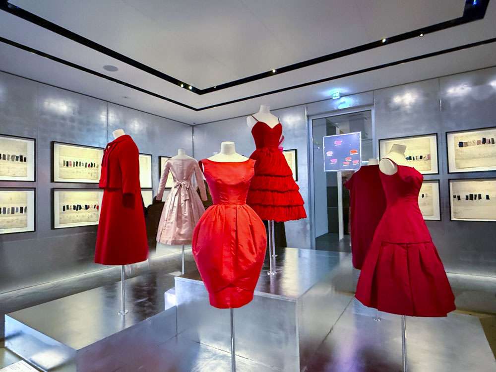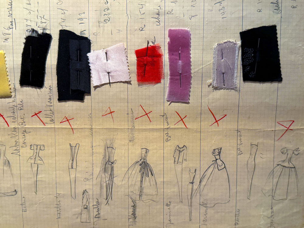 “ディオールのパレット”の部屋では、ムッシュが1947年春夏から1957年秋冬にかけて制作した22のコレクションのチャートを展示。生地スワッチから彼が好んだカラーパレットを探る。