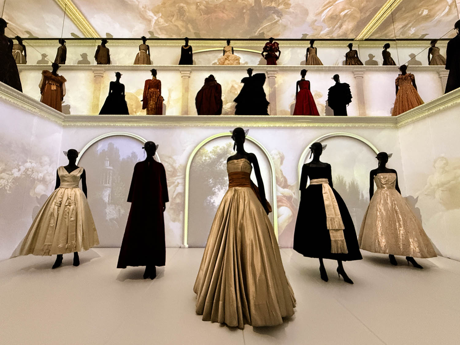 迫力の大ホール“ディオールの舞踏会”より。アライアが所有したディオールのドレスは前列に展示。