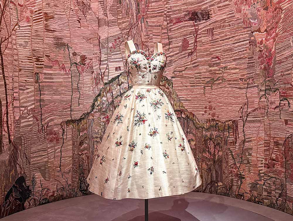 クリスチャン・ディオールによる1952年春夏オートクチュールのドレス。アーティストのエヴァ・ジョスパンが制作した手刺繍のテキスタイル作品『ミス ディオール』とともに展示。ジョスパンは、近年のマリア・グラツィア・キウリによるディオールのショーでも会場の装飾を手がけた。