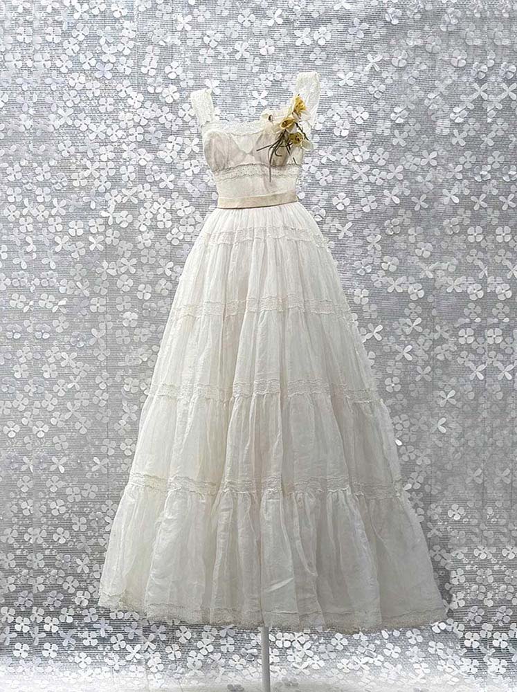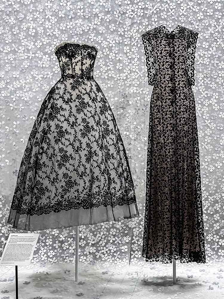 写真左:左はディオールによる1951年秋冬オートクチュールのドレス。チュールにリーフ模様のシャンティイレースが重なる。右はアライアによる2016年秋冬オートクチュールのドレス。同じくリーフ模様のレースが使われているが、ラッカー加工が施されている。右:ディオール「ブティック」ラインのドレス(1948年頃)。「ブティック」ラインは、メインコレクションの一部ルックを再構成したもので、“プレタポルテ”という概念が確立する以前に、その始まりを示した存在だといえる。