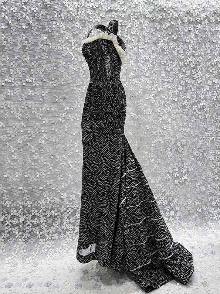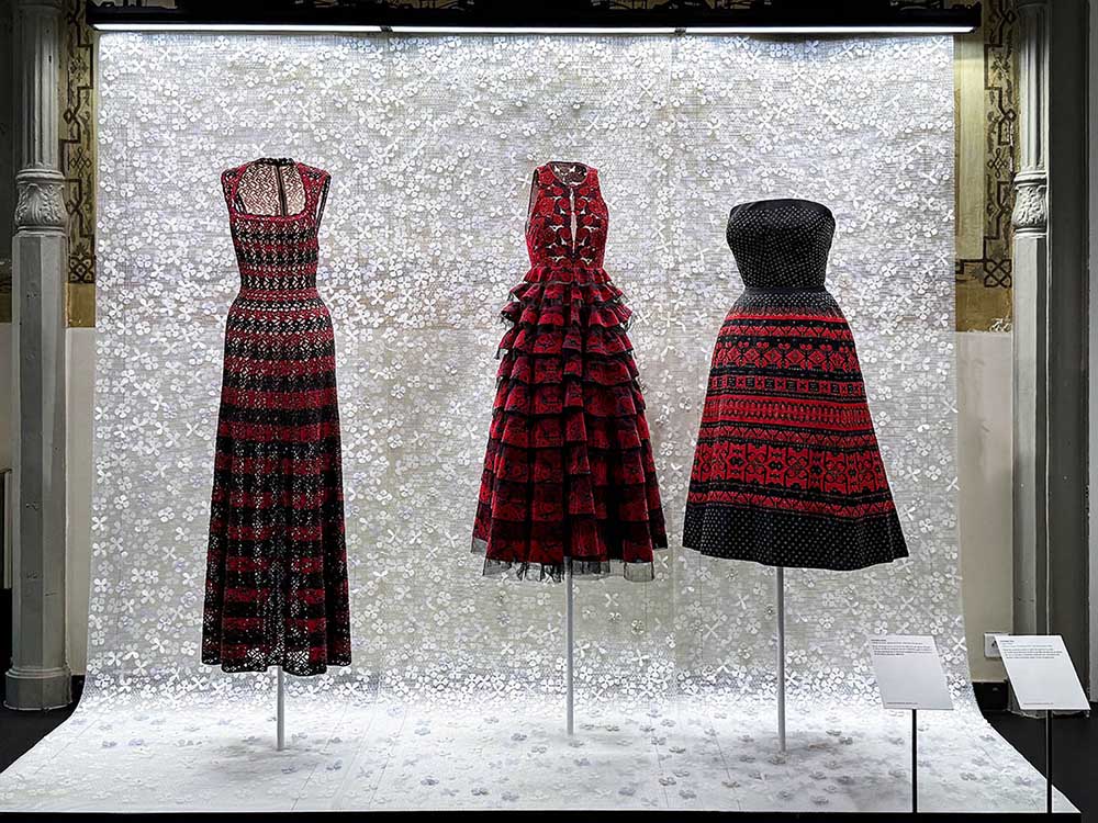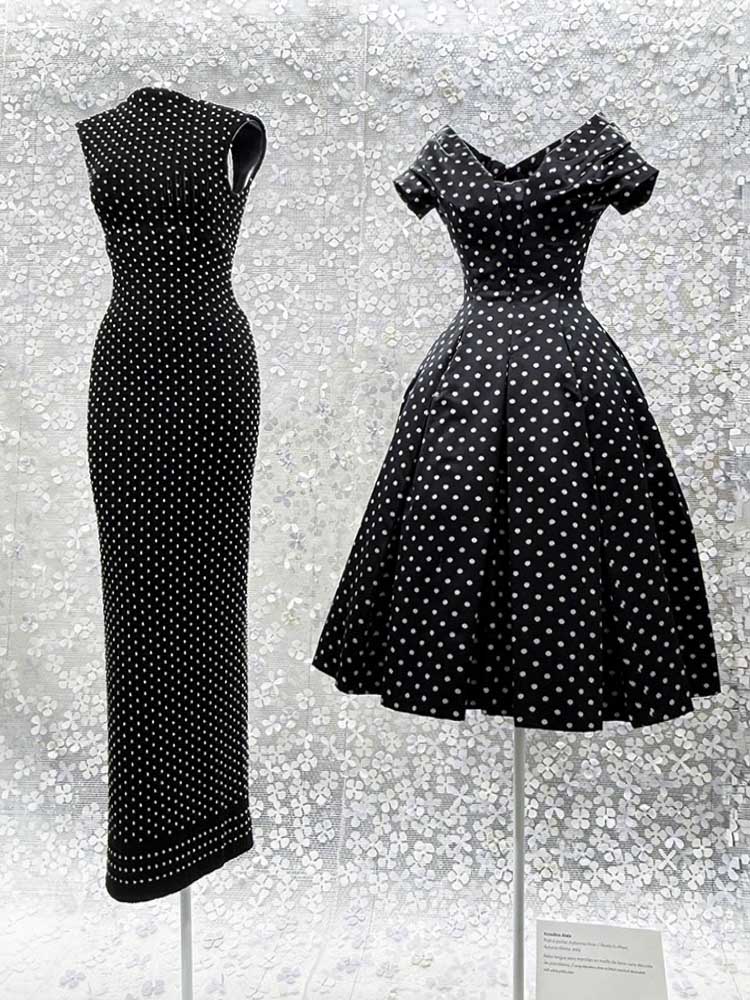 水玉シリーズ。写真左:アライアによる2006年春夏オートクチュールのドレス。右:アライアによる2013年秋冬プレタポルテのドレス(左)と、ディオールによる1954年秋冬オートクチュールのドレス。