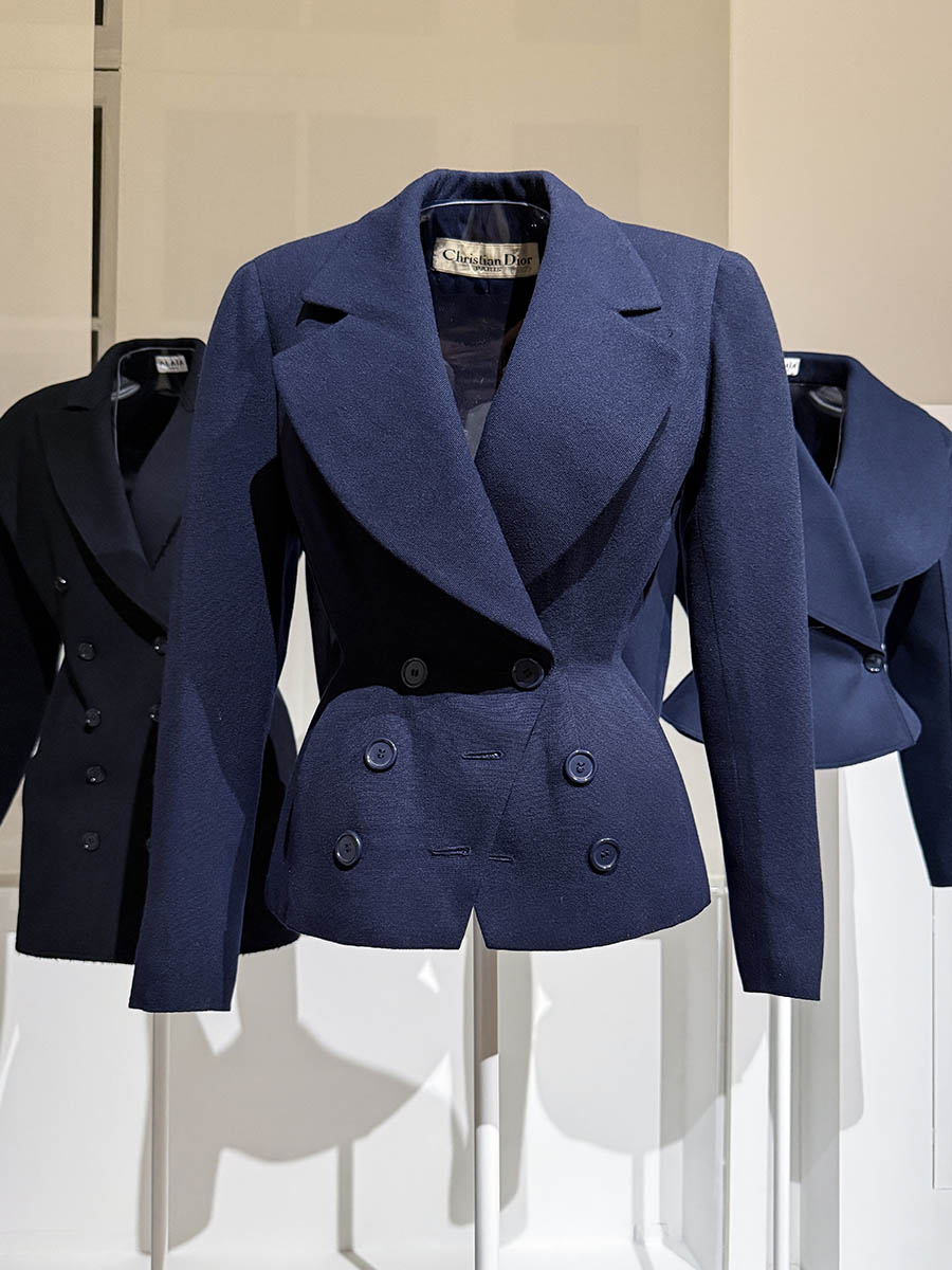 マリンブルーのダブルジャケットの対比。中央はディオール1950年春夏、両サイドはアライア1986年秋冬より。