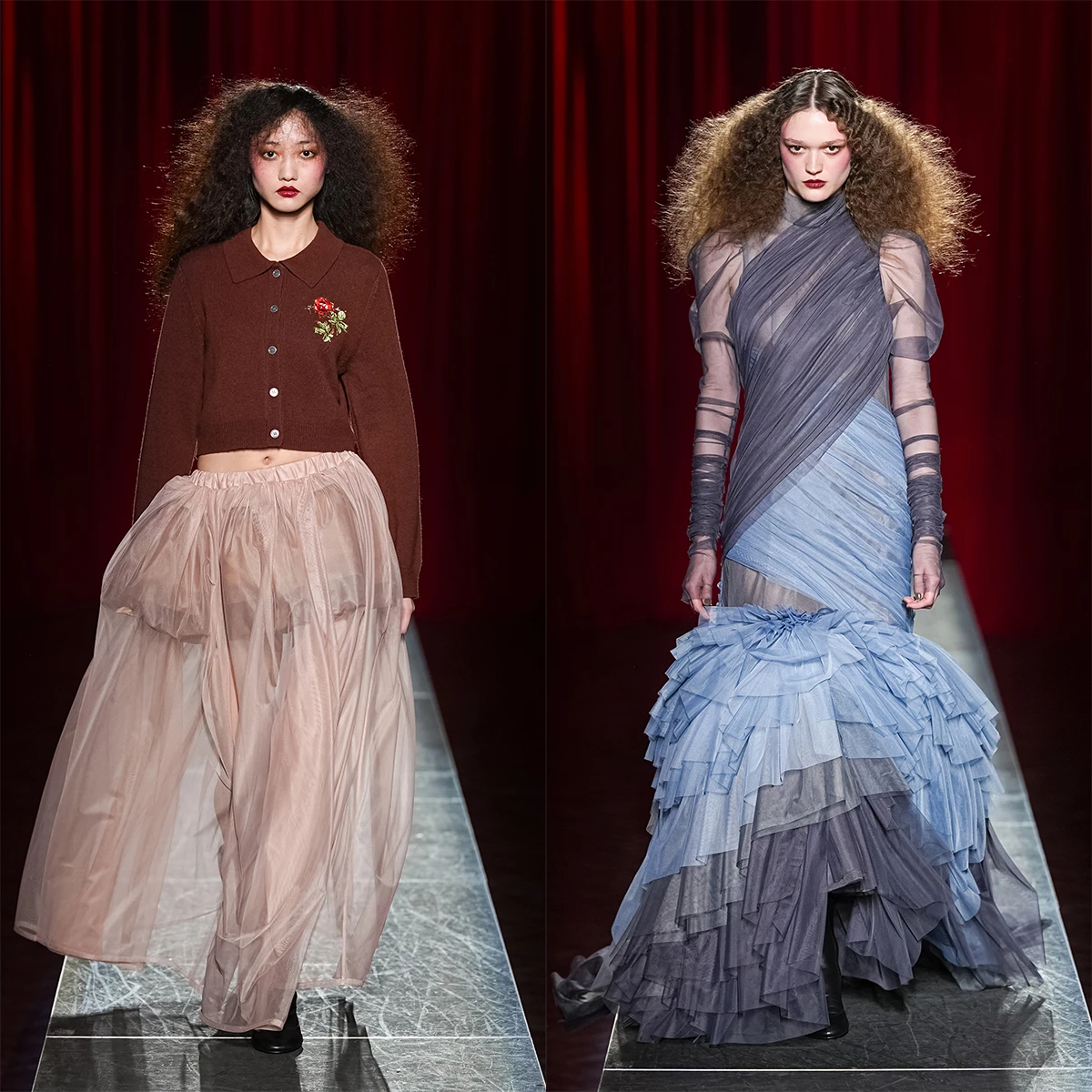 メゾン マルジェラ 2014-’15 秋冬アーティザナルの作品。ボディスーツは、18世紀の高級絹織物ランパス(宮廷の家具や衣装に好んで使われた文様織の生地)を再利用して作られた。花束やリボンのモチーフが、当時の室内装飾と共鳴する。