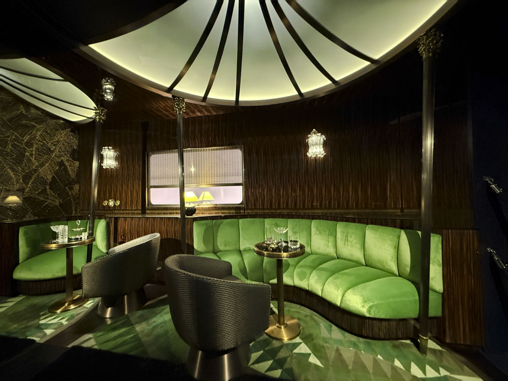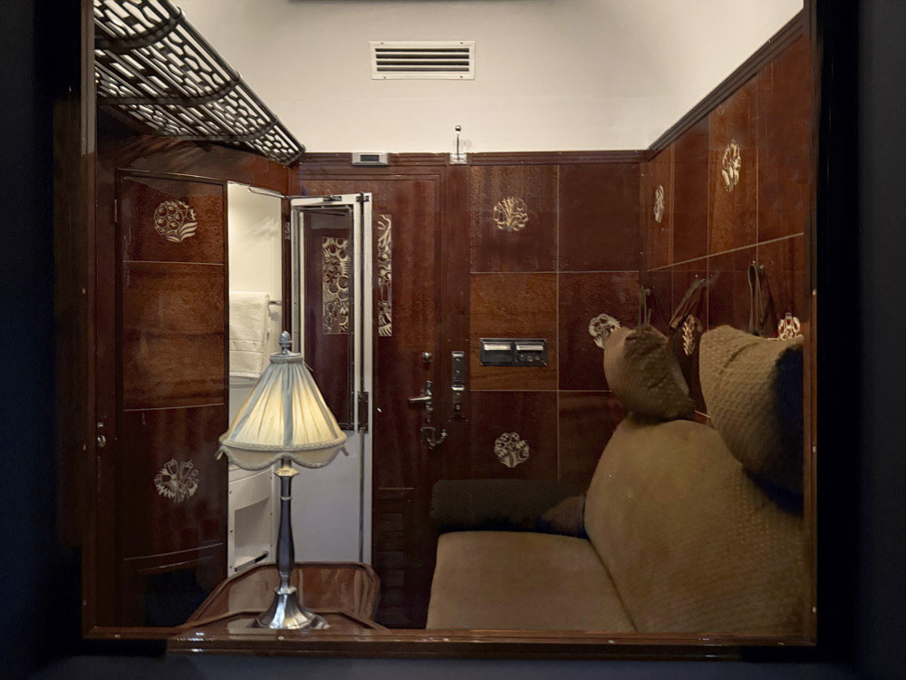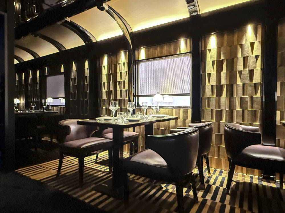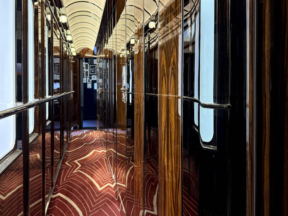 新オリエント急行の廊下、食堂、バーの車両の模型(2021–’25年)。