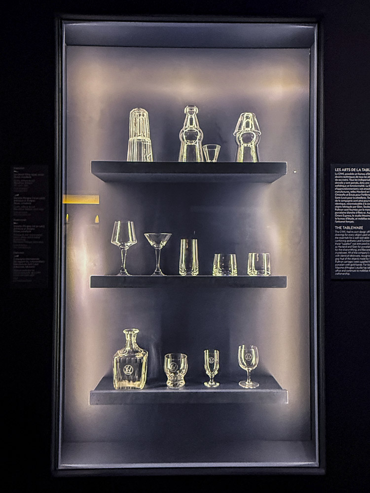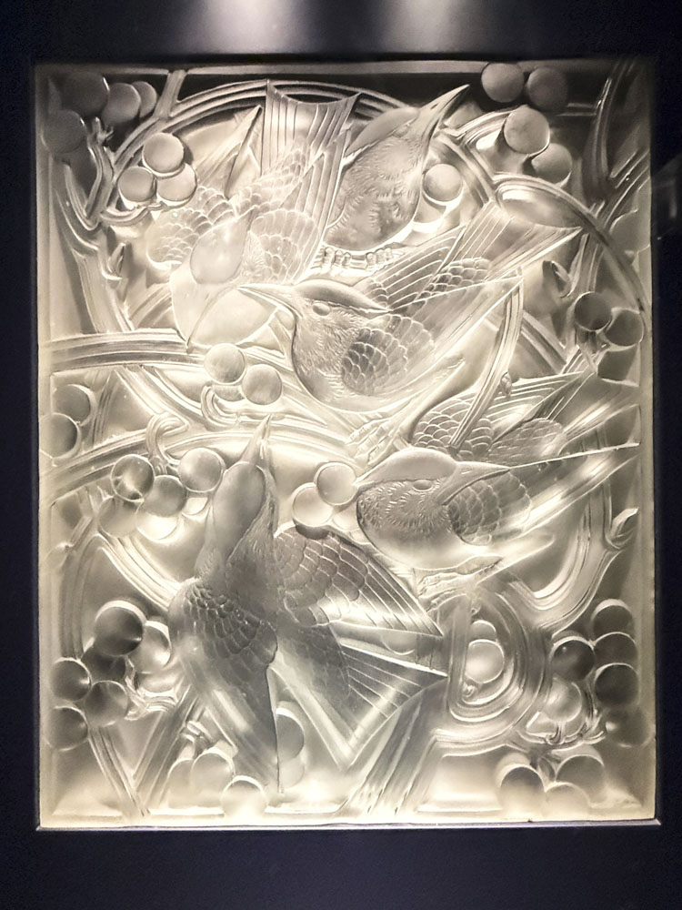 写真左:高級クリスタルで知られる老舗メゾン、サンルイ、バカラ、モーザーが手がけたグラス類。右:ルネ・ラリック作、ブドウと小鳥のモチーフが優雅なガラスの装飾パネル。寝台列車「コート・ダジュール・プルマン」のために制作された(1928年)。