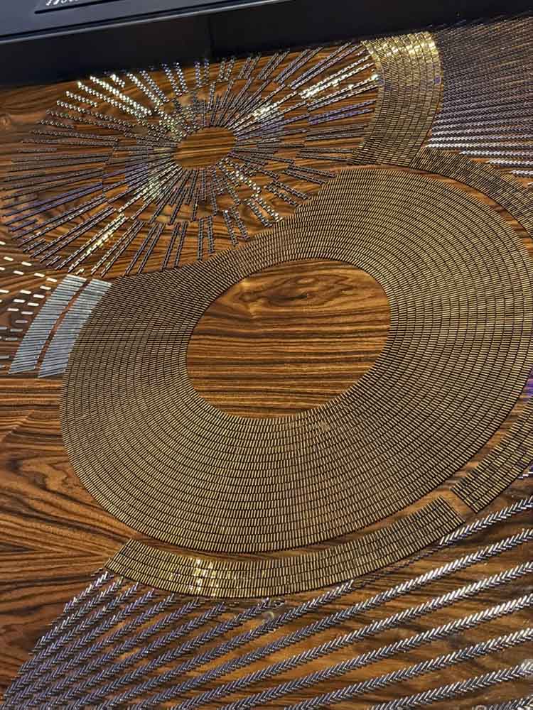 新オリエント急行スイートルームの壁面装飾。木地に日本製ビーズが刺繍されている(2022–’25年)。