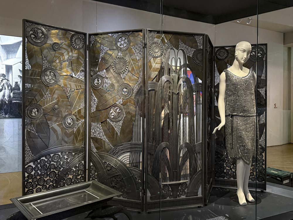 エドガー・ブラント作の屏風「オアシス」(1925年)。豊かな自然を思わせる背景の中で、鉄と真鍮による噴水が噴き上がっている。国際博覧会に出品されたこの作品は、傑作品として称賛された。ビーズ刺繍のイブニングドレスは、フランツ・ジュルダン作(1925年)。