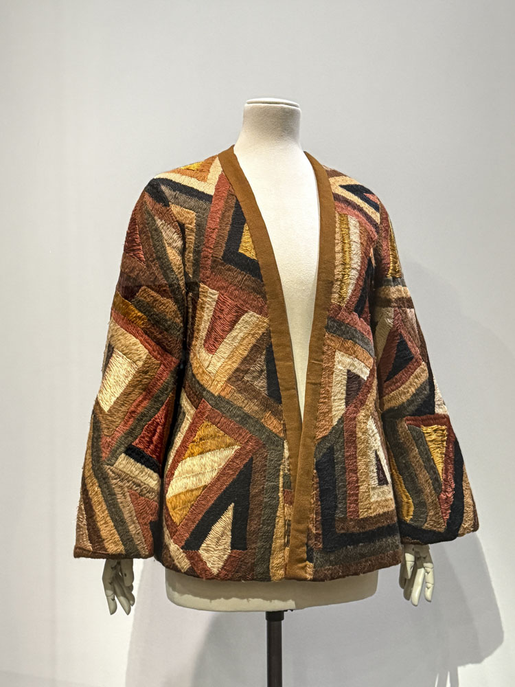 写真左:ソニア・ドローネー作のジャケット(1924年)。刺繍で表現された幾何学模様が印象的。右:シルクの生地に漆で模様を施したブラウス(1926年頃)。メゾン・ルイーズブーランジェによる作品と考えられている。漆装飾はジャン・デュナンが手がけた。